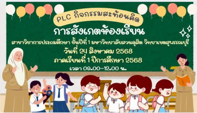 หลักสูตรศึกษาศาสตรบัณฑิต สาขาวิชาการประถมศึกษา มหาวิทยาลัยสวนดุสิต วิทยาเขตสุพรรณบุรี ได้จัดกิจกรรม PLC สะท้อนความคิด “การสังเกตห้องเรียน” ของนักศึกษาชั้นปีที่ 1 ภาคเรียนที่ 1 ปีการศึกษา 2568 โดยได้รับเกียรติจาก ผู้ช่วยศาสตราจารย์ ดร.สุนทร เทียนงาม อาจารย์ผู้ประสานงานหลักสูตรฯ เป็นประธานกล่าวเปิดงาน โดยมีคณาจารย์ และนักศึกษาชั้นปีที่ 1 ของหลักสูตรฯ เข้าร่วมกิจกรรม ในวันพุธที่ 24 กันยายน 2568 เวลา 09.00 – 12.00 น. ณ ห้องประชุมชั้น 3 อาคารศูนย์ความเป็นเลิศด้านการพิมพ์และบรรจุภัณฑ์ มหาวิทยาลัยสวนดุสิต วิทยาเขตสุพรรณบุรี