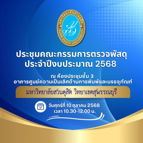 คณะกรรมการดำเนินการตรวจสอบพัสดุ มหาวิทยาลัยสวนดุสิต วิทยาเขตสุพรรณบุรี นำโดย ดร.วรานี เวสสุนทรเทพ รองอธิการบดีฝ่ายวิทยาเขตสุพรรณบุรี จัดประชุม คณะกรรมการดำเนินการตรวจสอบพัสดุ วิทยาเขตสุพรรณบุรี ประจำปีงบประมาณ พ.ศ. 2568 ครั้งที่ 1/2568 เพื่อรายงานผลการดำเนินการจำหน่ายครุภัณฑ์ และรายงานผลการตรวจสอบพัสดุ ประจำปีงบประมาณ พ.ศ 2568 และเพื่อเตรียมความพร้อมในการรับการตรวจฯ ประจำปี โดยการประชุมจัดขึ้นในวันศุกร์ ที่ 10 ตุลาคม 2568 เวลา 10.30-12.00 น. ณ ห้องประชุมชั้น 3 อาคารศูนย์ความเป็นเลิศด้านการพิมพ์และบรรจุภัณธฑ์ มหาวิทยาลัยสวนดุสิต