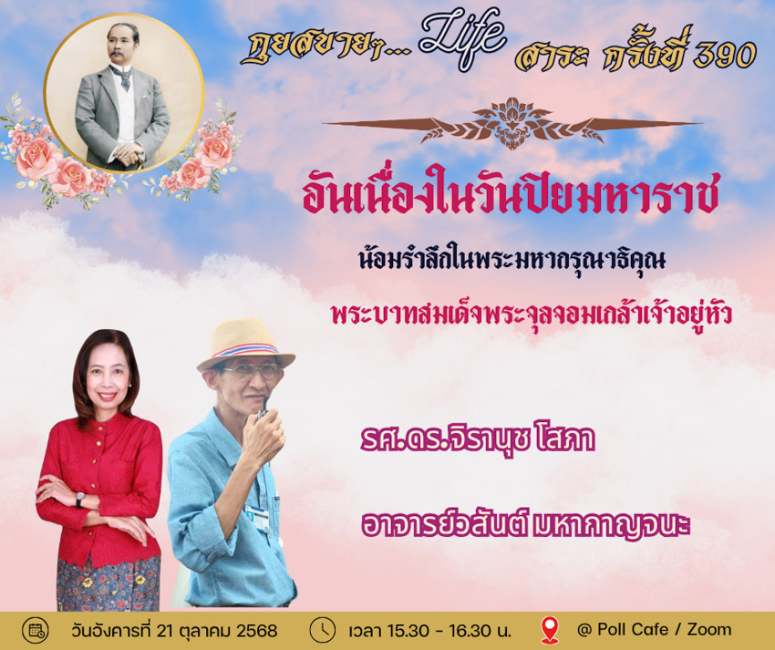 มหาวิทยาลัยสวนดุสิต วิทยาเขตสุพรรณบุรี เข้าร่วมกิจกรรม คุยสบายๆ … Life สาระ ครั้งที่ 390 หัวข้อ : “อันเนื่องในวันปิยมหาราช” ขอน้อมรำลึกในพระมหากรุณาธิคุณ พระบาทสมเด็จพระจุลจอมเกล้าเจ้าอยู่หัว พบกับ รองศาสตราจารย์ ดร.จิรานุช โสภา และ อาจารย์วสันต์ มหากาญจนะ โดยมีบุคลากรวิทยาเขตสุพรรณบุรี เข้าร่วมกิจกรรมผ่านระบบออนไลน์ โปรแกรม Zoom Meeting วันอังคารที่ 21 ตุลาคม 2568 เวลา 15.30-16.30 น. ณ อาคารศูนย์การเรียนรู้ระบบใหม่โดยใช้เทคโนโลยีเป็นสื่อ (SDU Library) ชั้น 1 โซนกลาง มหาวิทยาลัยสวนดุสิต วิทยาเขตสุพรรณบุรี