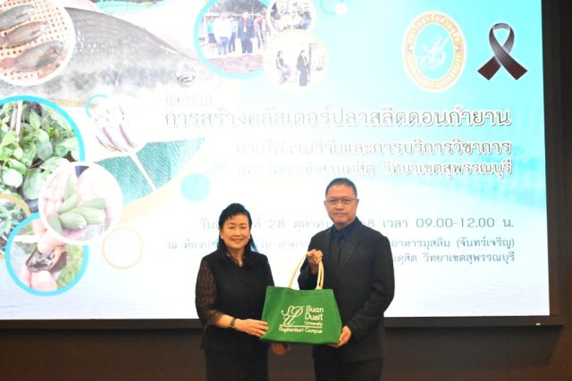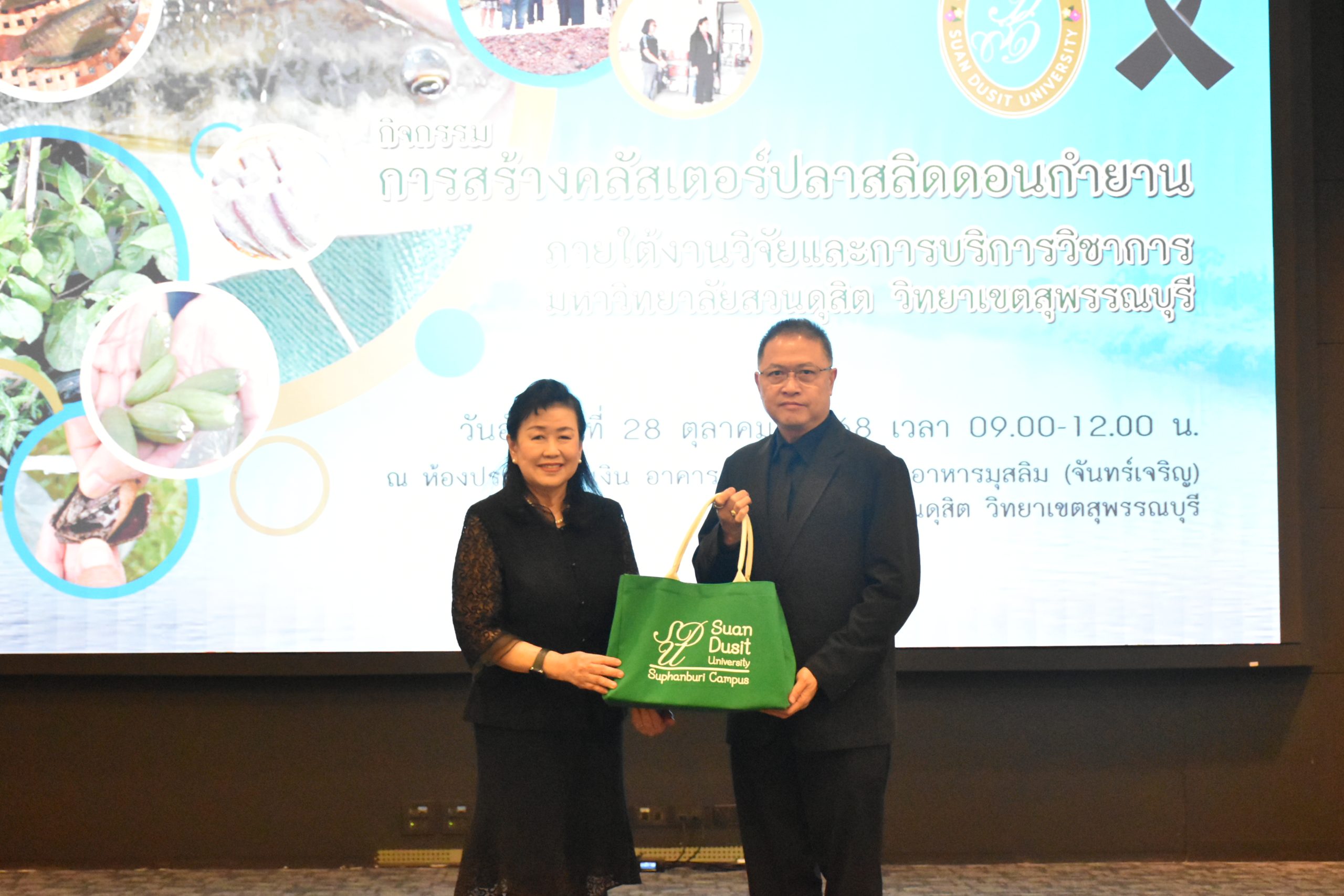 มหาวิทยาลัยสวนดุสิต วิทยาเขตสุพรรณบุรี นำโดย ดร.วรานี เวสสุนทรเทพ รองอธิการบดีฝ่ายวิทยาเขตสุพรรณบุรี จัดกิจกรรม การสร้างคลัสเตอร์ปลาสลิดดอนกำยานภายใต้งานวิจัย และการบริการวิชาการของมหาวิทยาลัยสวนดุสิต วิทยาเขตสุพรรณบุรี โดยได้รับเกียรติจาก นายกลวัชร ทรัพย์ส่งสุข รองผู้ว่าราชการจังหวัดสุพรรณบุรี เป็นประธานกล่าวเปิดกิจกรรม โดยการจัดกิจกรรมในครั้งนี้สืบเนื่องมาจากการตระหนักถึงความสำคัญของการพัฒนาศักยภาพของวิสาหกิจชุมชนและผู้ประกอบการปลาสลิดดอนกำยานของจังหวัดสุพรรณบุรี และการสร้างเครือข่ายคลัสเตอร์ปลาสลิดดอนกำยาน โดยมีหน่วยงานทั้งภาครัฐ ภาคเอกชน และผู้ประกอบการที่เกี่ยวข้องเข้าร่วมในกิจกรรม ในวันอังคารที่ 28 ตุลาคม 2568 เวลา 09.00-12.00 น. ณ ห้องประชุมพวงเงิน อาคารศูนย์ฝึกปฏิบัติการอาหารมุสลิม (อาคารจันทร์เจริญ) มหาวิทยาลัยสวนดุสิต วิทยาเขตสุพรรณบุรี