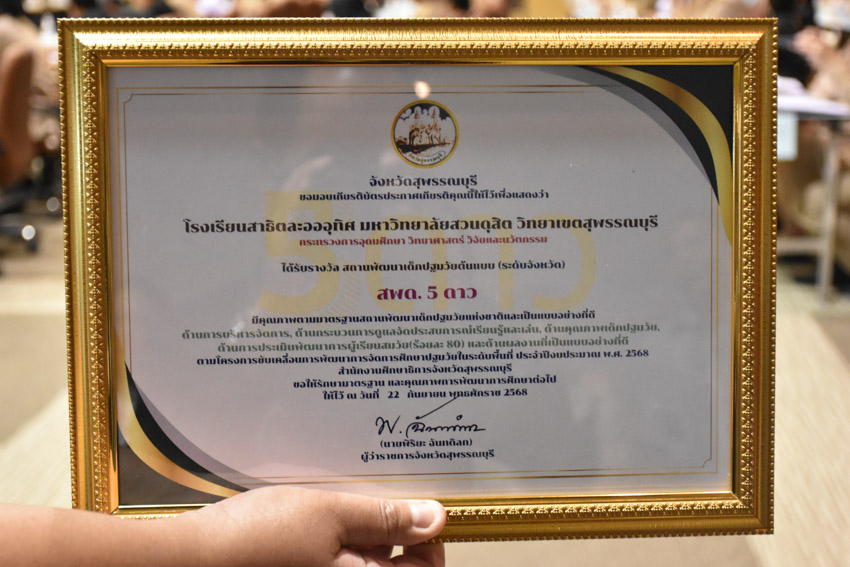มหาวิทยาลัยสวนดุสิต วิทยาเขตสุพรรณบุรี นำโดย ดร.วรานี เวสสุนทรเทพ รองอธิการบดีฝ่ายวิทยาเขตสุพรรณบุรี นางกัณณ์อลิน สุอังคะวาทิน ผู้อำนวยการสำนักงานวิทยาเขตสุพรรณบุรี พร้อมคุณครูโรงเรียนสาธิตละอออุทิศ สุพรรณบุรี เข้าร่วมประชุมคณะกรรมการจังหวัดและหัวหน้าส่วนราชการ จังหวัดสุพรรณบุรี ครั้งที่ 10/2568 ประจำเดือนตุลาคม 2568 โดยมี นายพิริยะ ฉันทดิลก ผู้ว่าราชการจังหวัดสุพรรณบุรี เป็นประธานการประชุม โดยในครั้งนี้ ผู้แทนจากโรงเรียนสาธิตละอออุทิศ สุพรรณบุรี ยังได้เข้ารับเกียรติบัตร และโล่ประกาศเกียรติคุณ ในการได้รับคัดเลือกเป็น “สถานพัฒนาเด็กปฐมวัยต้นแบบ ระดับจังหวัดสุพรรณบุรี ประจำปี 2568” สพด. 5 ดาว ซึ่งถือเป็นเกียรติและความภาคภูมิใจอย่างยิ่ง ที่การอุทิศตนของคณะครูและบุคลากรในการพัฒนาคุณภาพการศึกษาปฐมวัย ได้รับการยอมรับในระดับจังหวัด โดยการประชุมฯ จัดขึ้นในวันพุธที่ 29 ตุลาคม 2568 เวลา 09.00-12.00 น. ณ หอประชุม อาชาสีหมอก ศาลากลางจังหวัดสุพรรณบุรี
