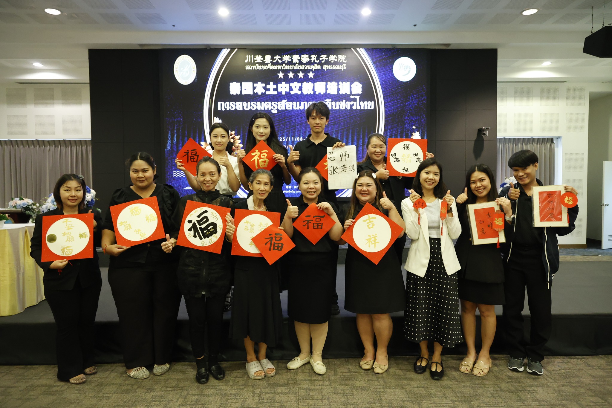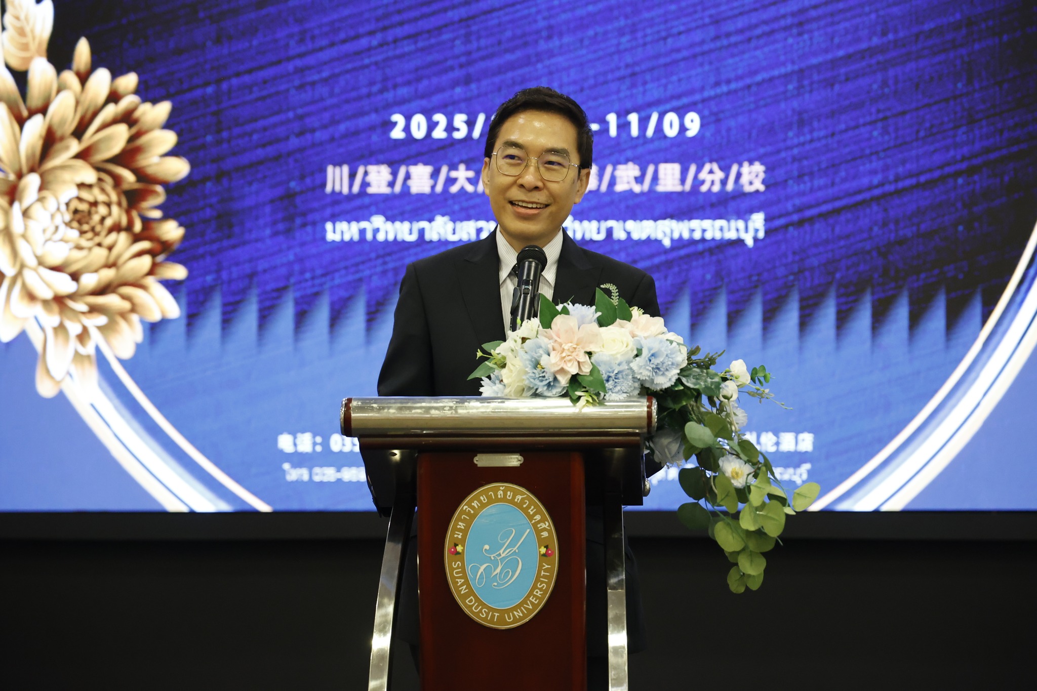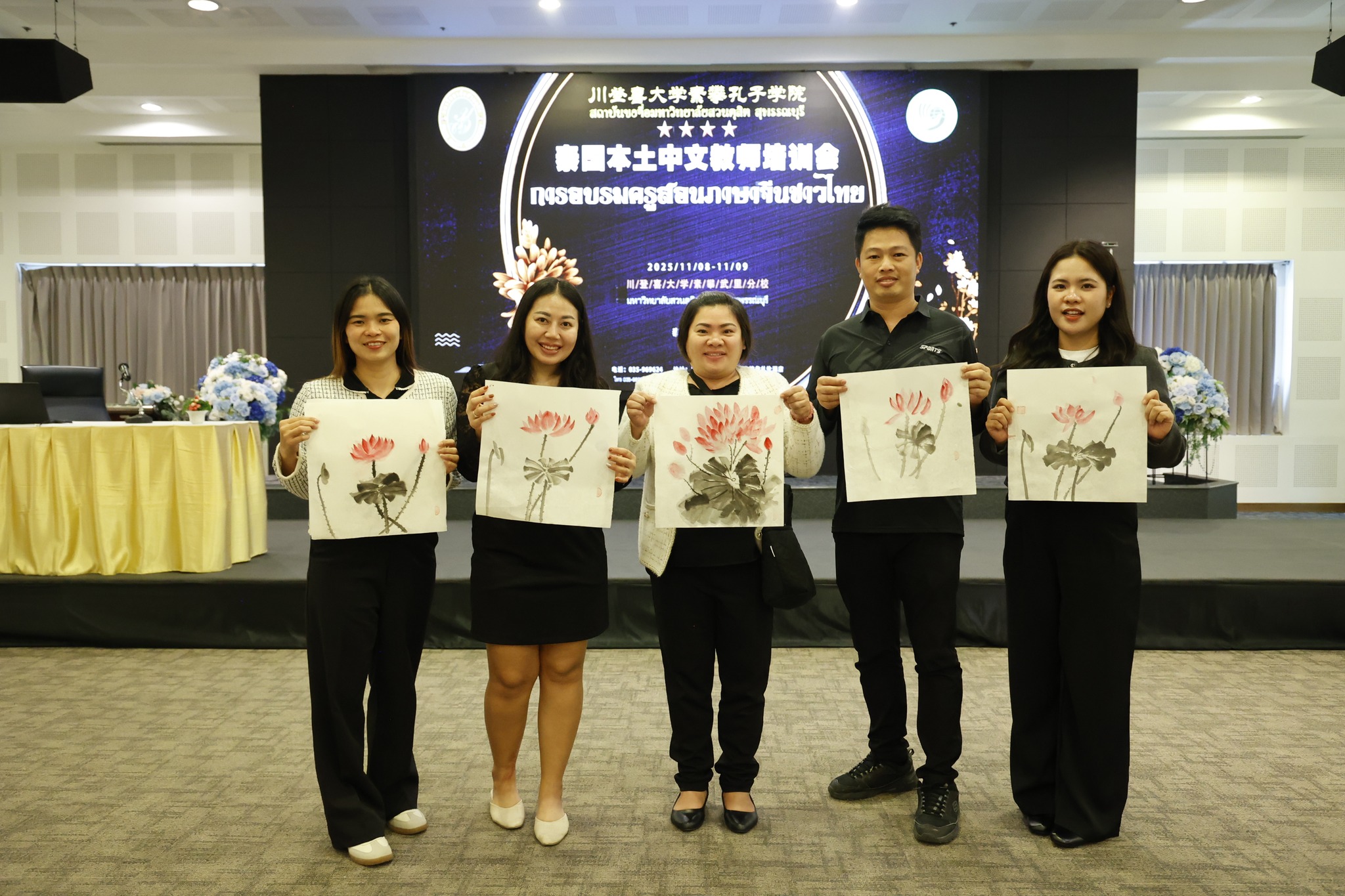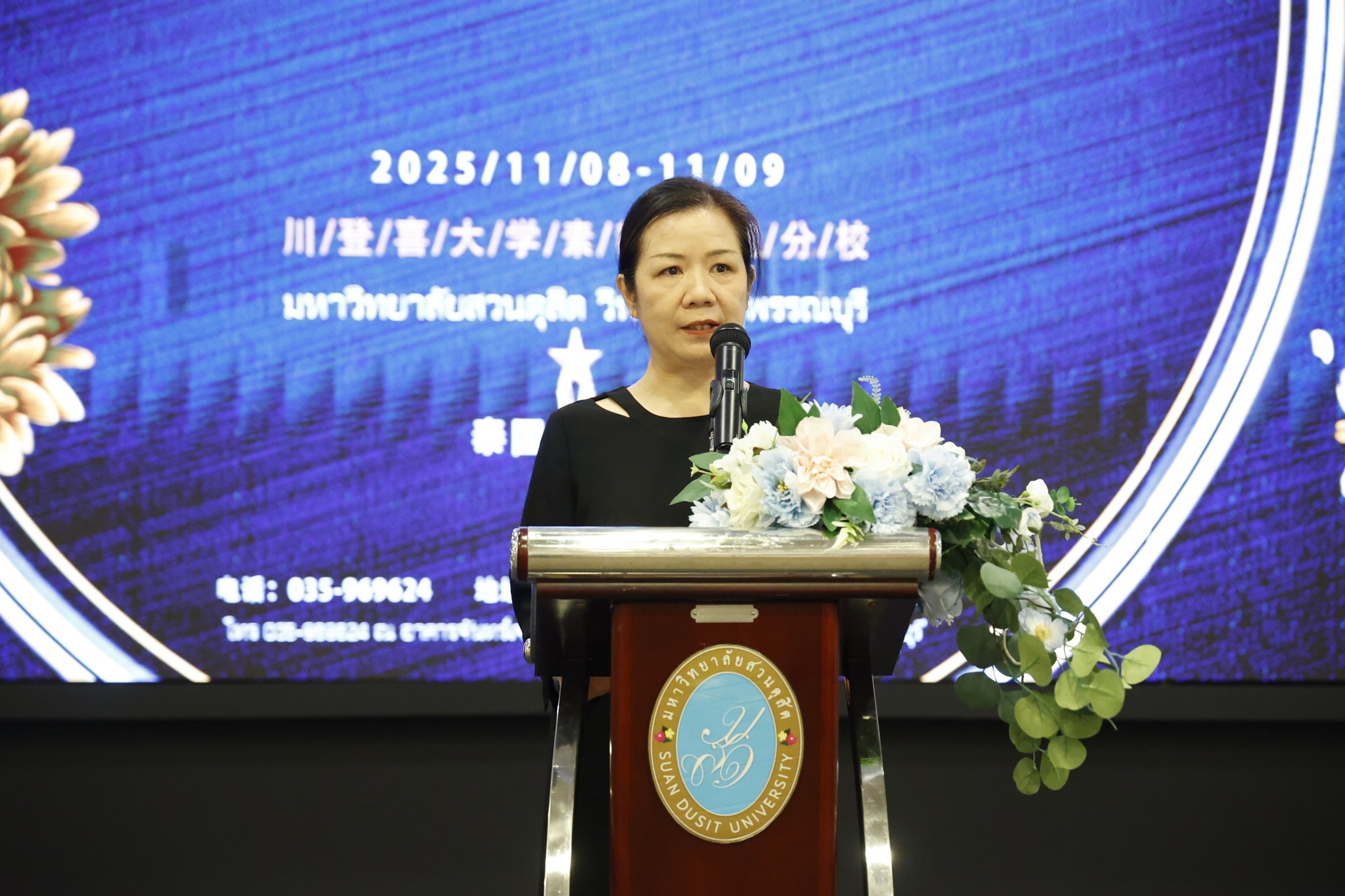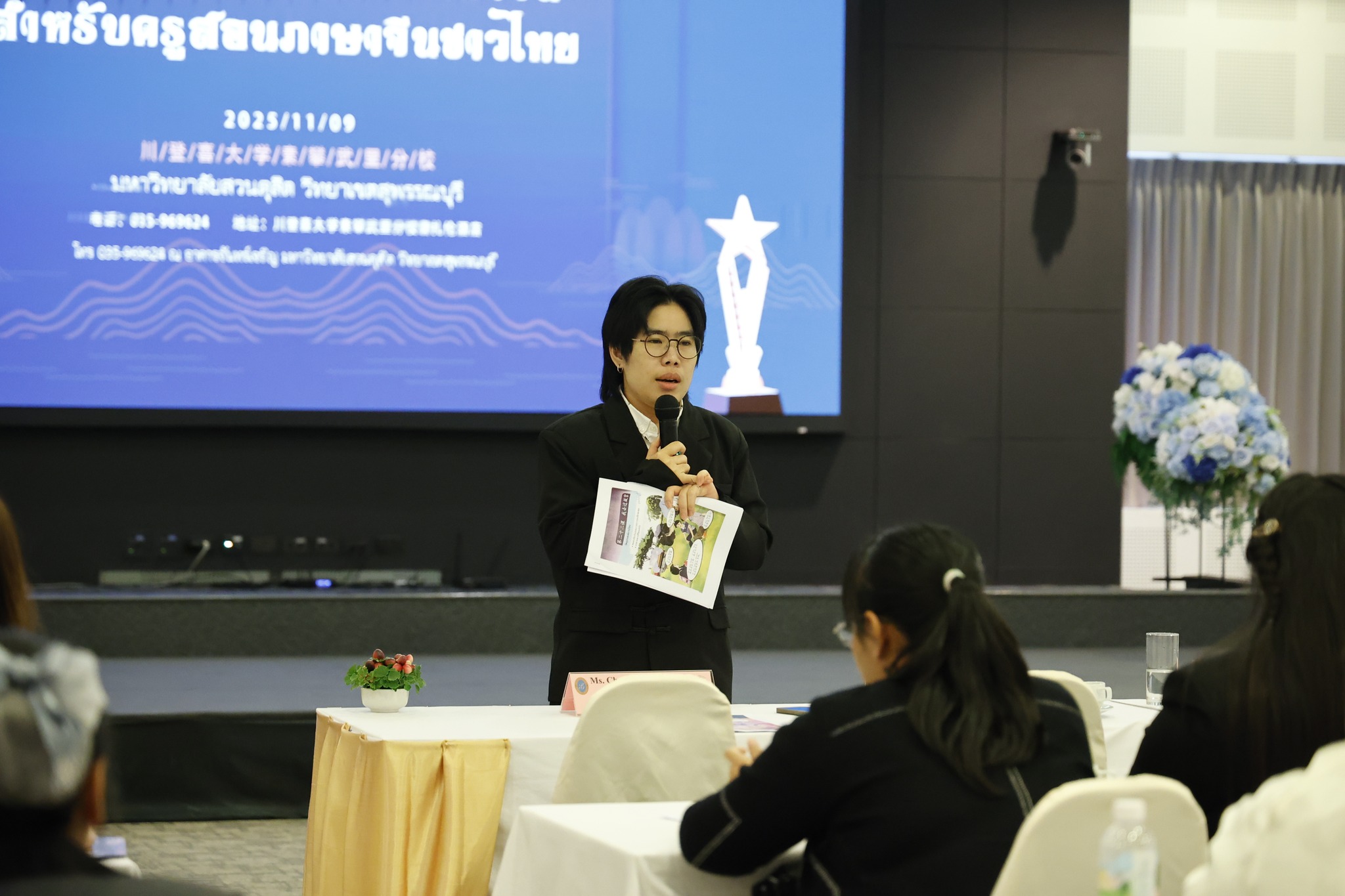 สถาบันขงจื่อ มหาวิทยาลัยสวนดุสิต สุพรรณบุรี จัดการอบรมครูสอนภาษาจีนชาวไทย ประจำปี 2568 โดยได้รับเกียรติจาก ดร.พันธรักษ์ ผูกพันธ์ ผู้อำนวยการสถาบันขงจื่อมหาวิทยาลัยสวนดุสิตสุพรรณบุรี ฝ่ายไทย และ Mrs.Wei Yubing ผู้อำนวยการสถาบันขงจื่อ มหาวิทยาลัยสวนดุสิต สุพรรณบุรี ฝ่ายจีน เป็นประธานกล่าวต้อนรับและกล่าวเปิดงาน โดยมีการอบรมทักษะด้านวัฒนธรรมจีนให้กับครูสอนภาษาจีนชาวไทยประกอบด้วยกิจกรรมดังนี้ การเขียนพู่กันจีน ศิลปะการวาดภาพจีน การดัดลวดกำมะหยี่แบบจีน โดยกิจกรรมจัดขึ้นระหว่างที่ 8-9 พฤศจิกายน 2568 เวลา 08.30-16.00 น. ณ ห้องประชุมพวงเงิน ศูนย์ปฏิบัติการอาหารมุสลิม (อาจารจันทร์เจริญ) มหาวิทยาลัยสวนดุสิต วิทยาเขตสุพรรณบุรี