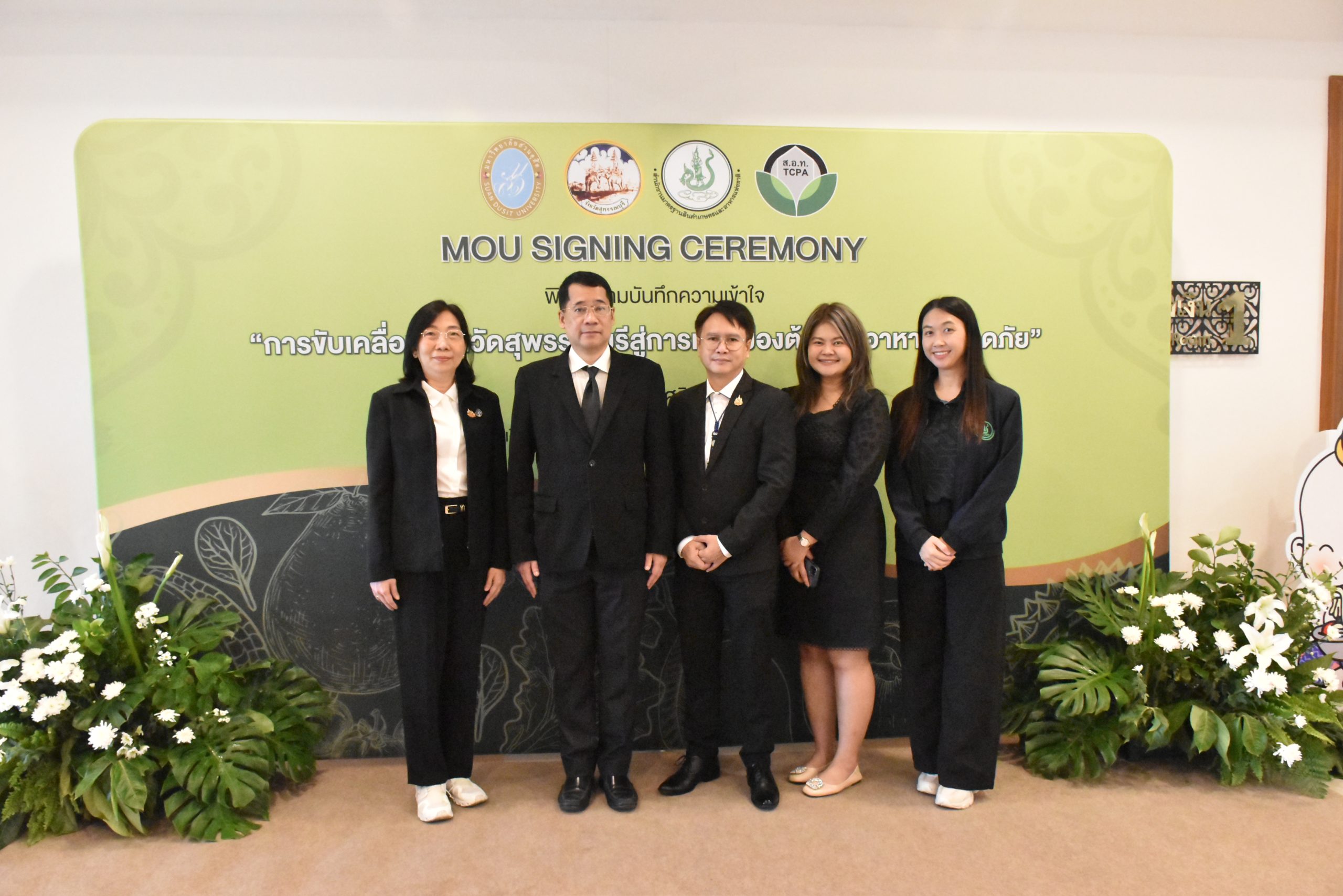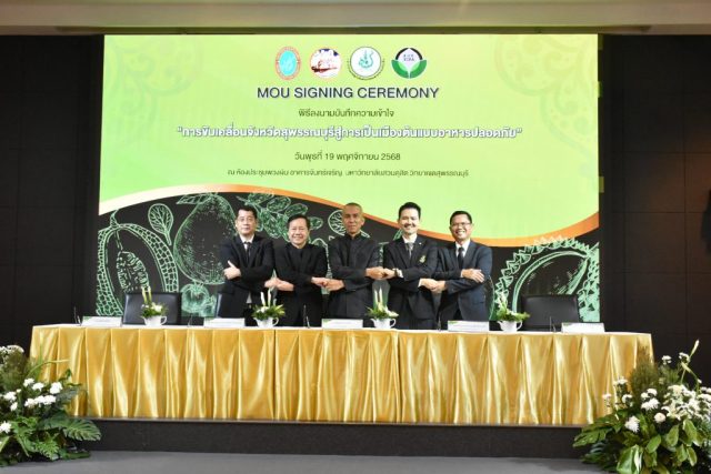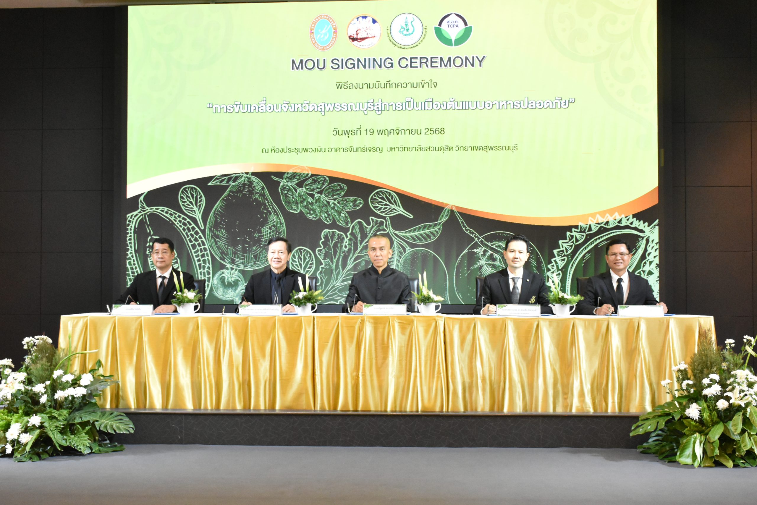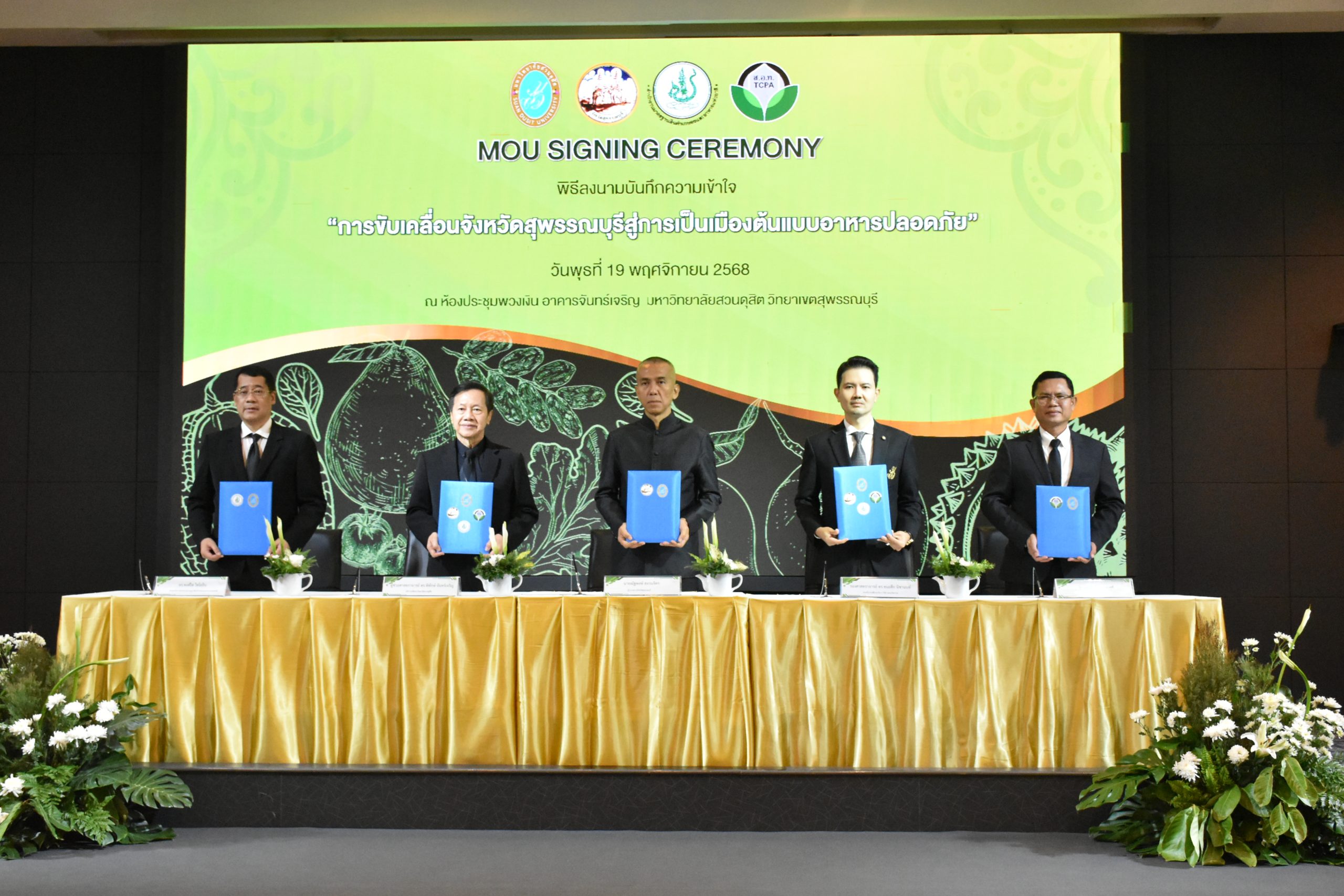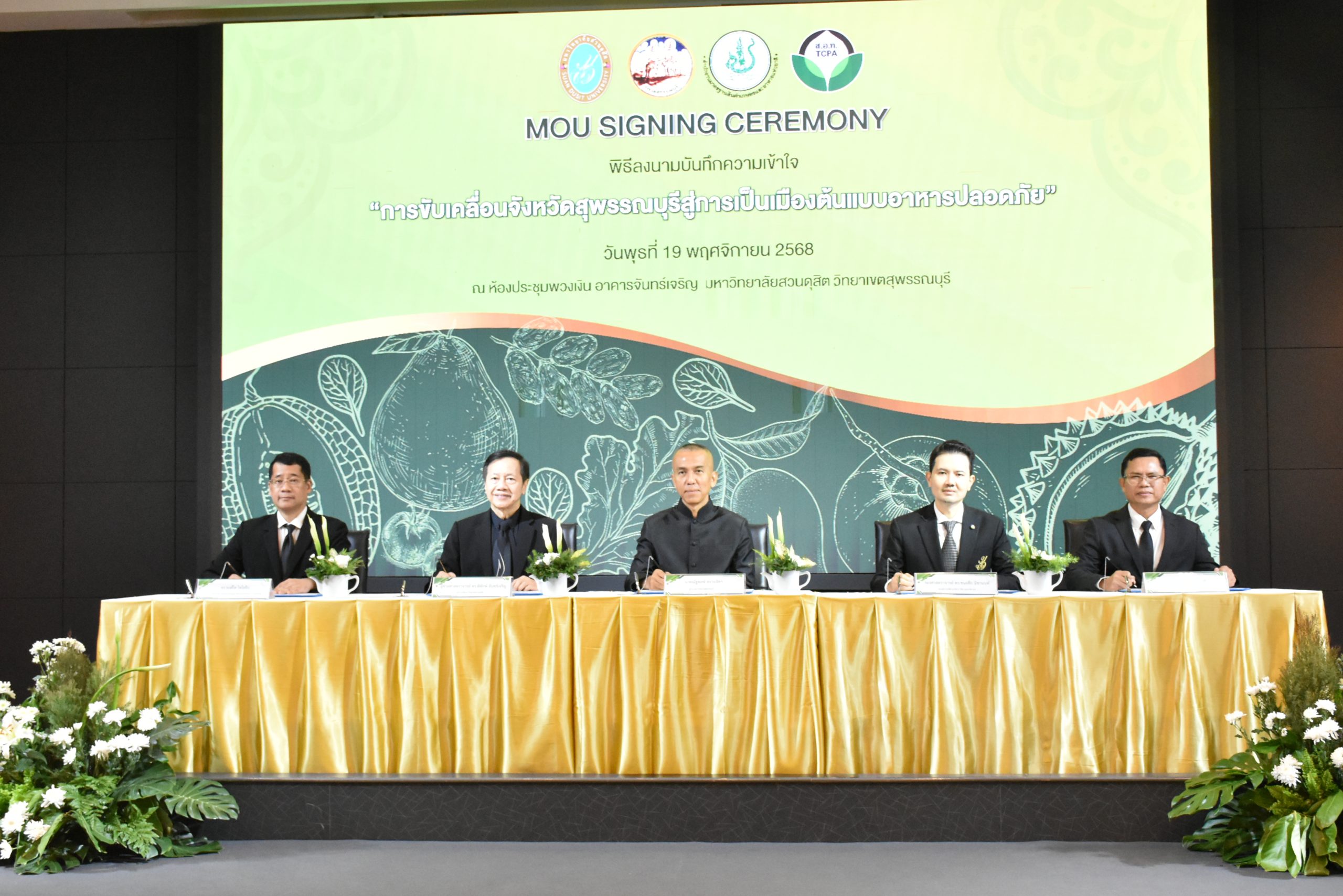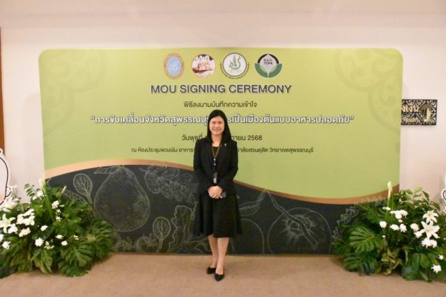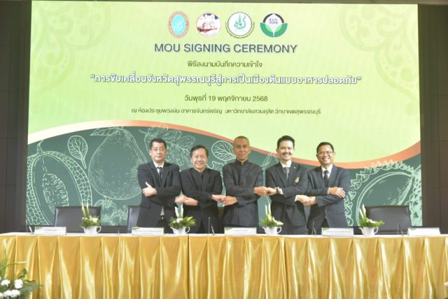 มหาวิทยาลัยสวนดุสิต วิทยาเขตสุพรรณบุรี นำโดย นางกัณณ์อลิน สุอังคะวาทิน ผู้อำนวยการสำนักงานวิทยาเขตสุพรรณบุรี และ นางสาวจุฑารัตน์ จิ๋วสง่า ผู้อำนวยการกองกลาง พร้อมบุคลากร ให้การต้อนรับ สำนักนวัตกรรมชุมชน มหาวิทยาลัยสวนดุสิต ในการจัดพิธีลงนามบันทึกความเข้าใจในการขับเคลื่อนจังหวัดสุพรรณบุรีสู่การเป็นเมืองต้นแบบอาหารปลอดภัย ระหว่างมหาวิทยาลัยสวนดุสิตกับสำนักงานมาตรฐานสินค้าเกษตรและอาหารแห่งชาติ สมาคมอารักขาพืชไทย และจังหวัดสุพรรณบุรี โดยได้รับเกียรติจาก นายณัฐพงษ์ สงวนจิตร ผู้ว่าราชการจังหวัดสุพรรณบุรี ดร.พงศ์ไท ไทโยธิน รองเลขาธิการ มกอช. นายสมศักดิ์ สมานวงศ์ นายกสมาคม อารักขาพืชไทย ผู้ช่วยศาสตราจารย์ ดร.พิทักษ์ จันทร์เจริญ อธิการบดี มหาวิทยาลัยสวนดุสิต และรองศาสตราจารย์ ดร.ชนะศึก นิชานนท์ รองอธิการบดีฝ่ายบริหารวิจัย และนวัตกรรม มหาวิทยาลัยสวนดุสิต ให้เกียรติเข้าร่วมลงในฐานะตัวแทนของหน่วยงาน โดยมีหัวหน้าส่วนราชการ ผู้บริหารมหาวิทยาลัย บุคลากร นักศึกษาและเกษตรกรให้ความสนใจเข้าร่วมเป็นจำนวนมาก นอกจากนี้ ภายในงานยังมีกิจกรรมการจัดแสดงบูธนิทรรศการสินค้าเกษตรและสินค้าแปรรูปที่ได้รับการรับรองมาตรฐานเกษตรปลอดภัย (GAP) และมาตรฐานแบรนด์น้องเหน่อของจังหวัดสุพรรณบุรี จำนวน 15 บูธ ตลอดจนกิจกรรมการเสวนาภายใต้โครงการ “การยกระดับห่วงโซ่คุณค่าปลาสลิดดอนกำยานเพื่อขับเคลื่อนเศรษฐกิจสร้างสรรค์” ในวันพุธที่ 19 พฤศจิกายน 2568 เวลา 09.00-15.00 น. ณ ห้องประชุมพวงเงิน ศูนย์ฝึกปฏิบัติการอาหารมุสลิม (อาคารจันทร์เจริญ) มหาวิทยาลัยสวนดุสิต วิทยาเขตสุพรรณบุรี