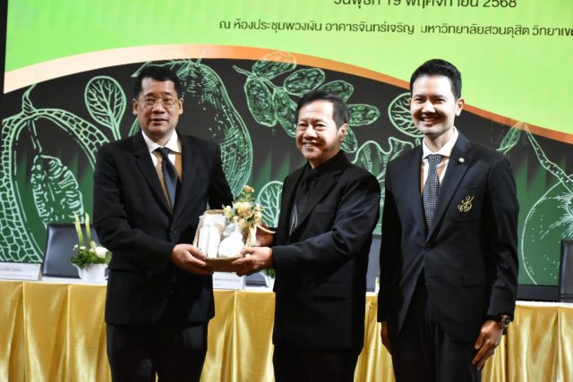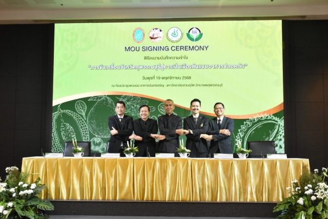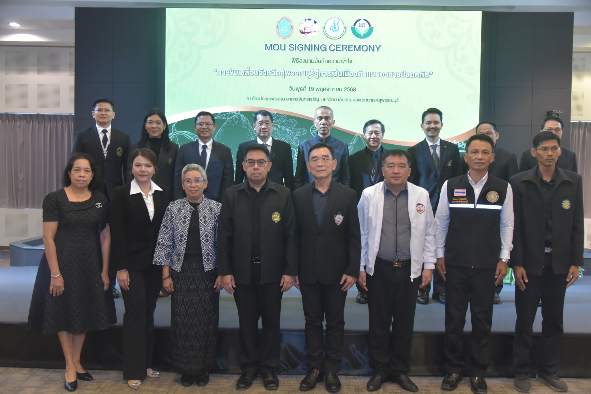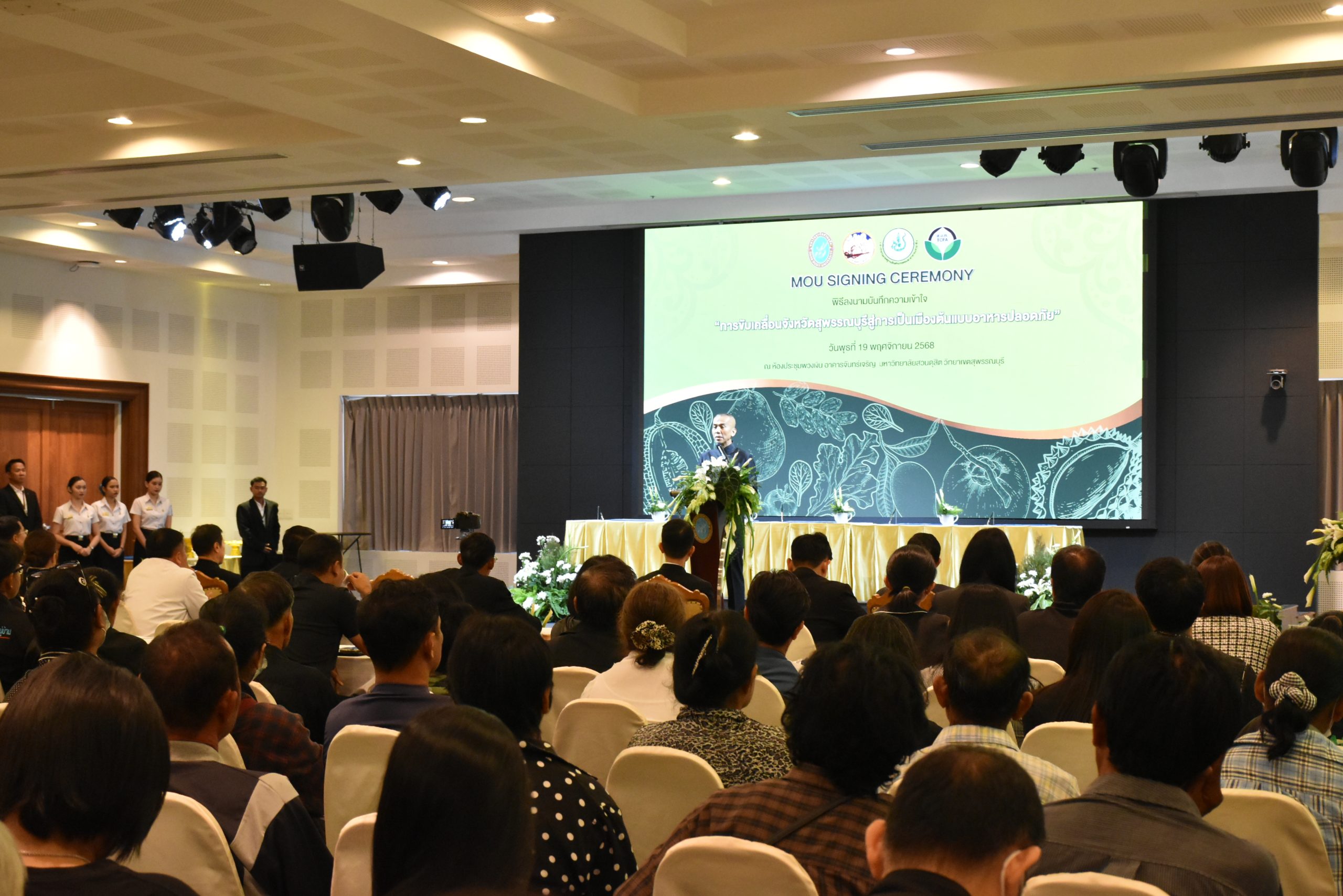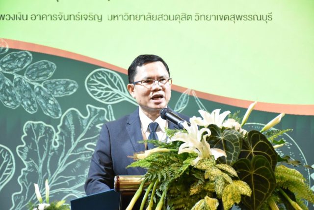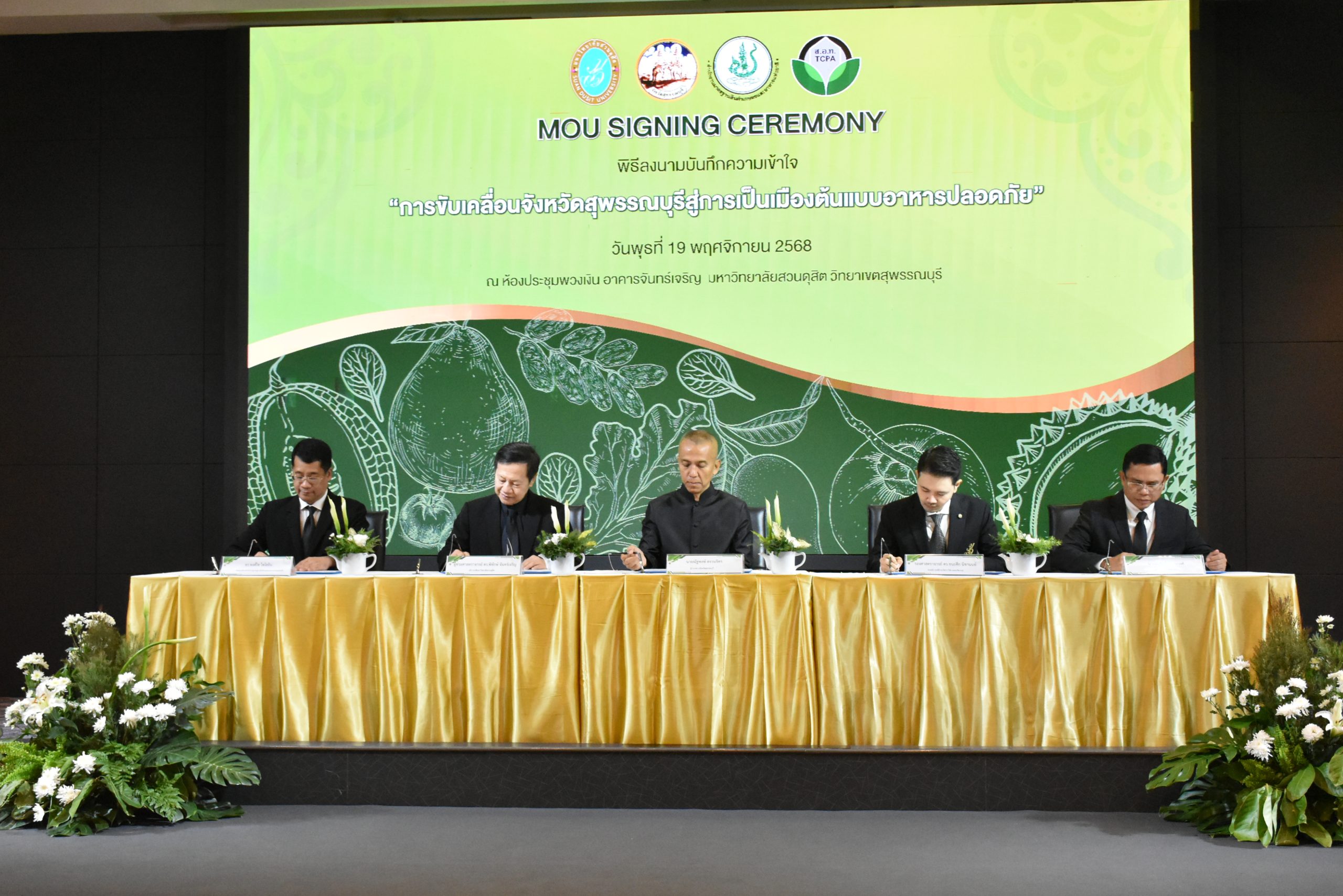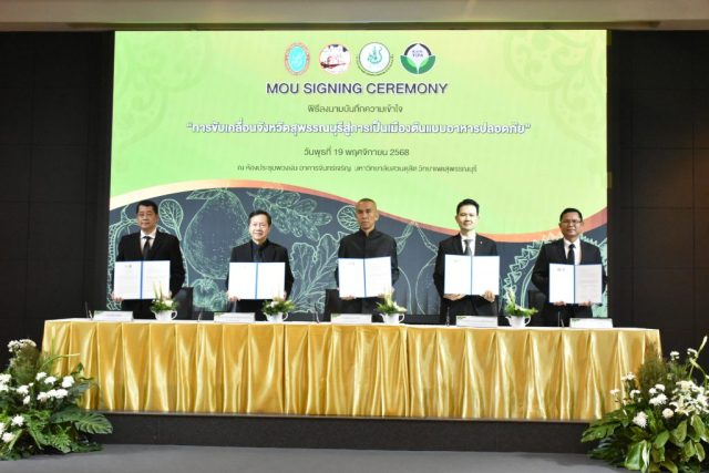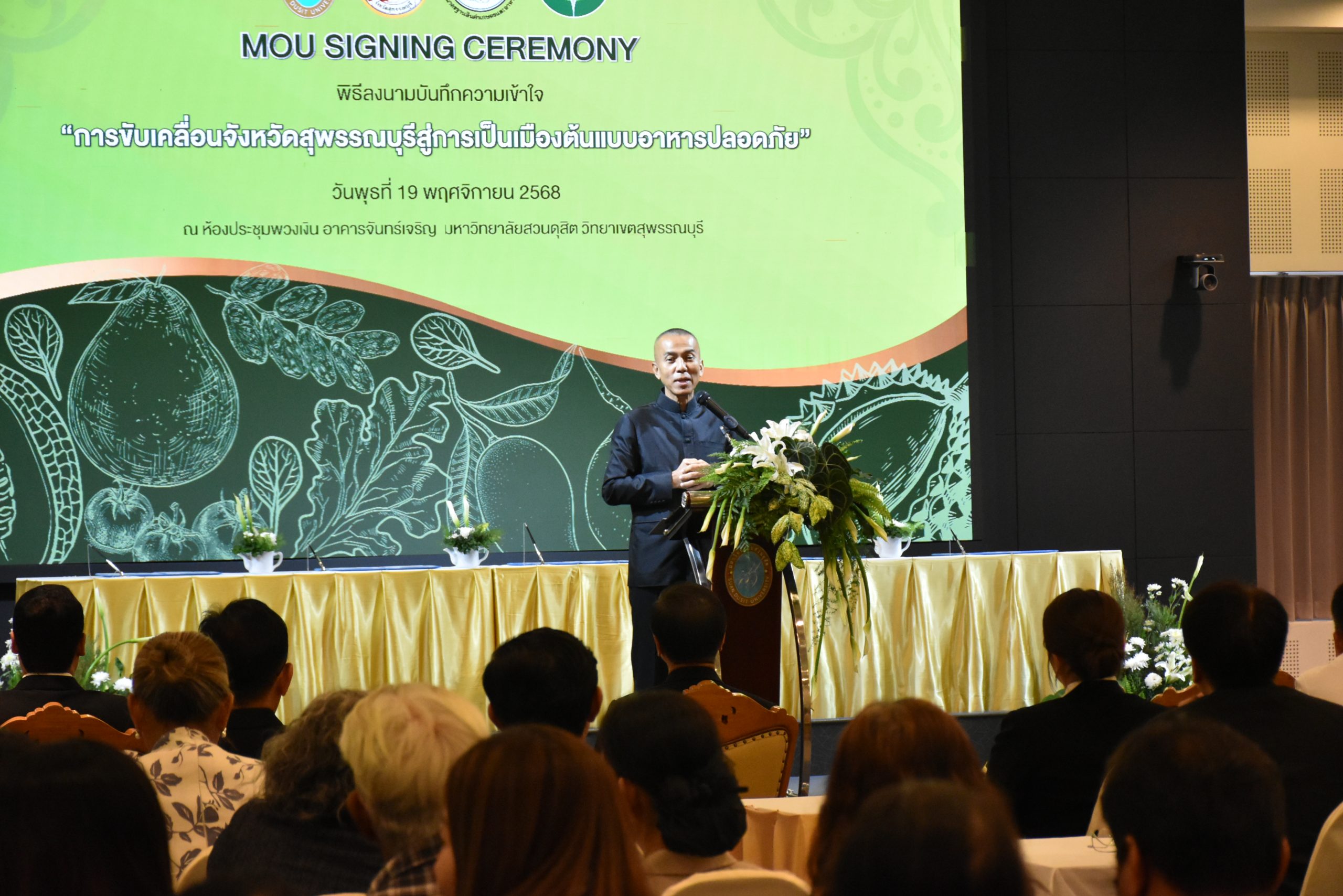 มหาวิทยาลัยสวนดุสิต วิทยาเขตสุพรรณบุรี นำโดย นางกัณณ์อลิน สุอังคะวาทิน ผู้อำนวยการสำนักงานวิทยาเขตสุพรรณบุรี และ นางสาวจุฑารัตน์ จิ๋วสง่า ผู้อำนวยการกองกลาง พร้อมบุคลากร ให้การต้อนรับ สำนักนวัตกรรมชุมชน มหาวิทยาลัยสวนดุสิต ในการจัดพิธีลงนามบันทึกความเข้าใจในการขับเคลื่อนจังหวัดสุพรรณบุรีสู่การเป็นเมืองต้นแบบอาหารปลอดภัย ระหว่างมหาวิทยาลัยสวนดุสิตกับสำนักงานมาตรฐานสินค้าเกษตรและอาหารแห่งชาติ สมาคมอารักขาพืชไทย และจังหวัดสุพรรณบุรี โดยได้รับเกียรติจาก นายณัฐพงษ์ สงวนจิตร ผู้ว่าราชการจังหวัดสุพรรณบุรี ดร.พงศ์ไท ไทโยธิน รองเลขาธิการ มกอช. นายสมศักดิ์ สมานวงศ์ นายกสมาคม อารักขาพืชไทย ผู้ช่วยศาสตราจารย์ ดร.พิทักษ์ จันทร์เจริญ อธิการบดี มหาวิทยาลัยสวนดุสิต และรองศาสตราจารย์ ดร.ชนะศึก นิชานนท์ รองอธิการบดีฝ่ายบริหารวิจัย และนวัตกรรม มหาวิทยาลัยสวนดุสิต ให้เกียรติเข้าร่วมลงในฐานะตัวแทนของหน่วยงาน โดยมีหัวหน้าส่วนราชการ ผู้บริหารมหาวิทยาลัย บุคลากร นักศึกษาและเกษตรกรให้ความสนใจเข้าร่วมเป็นจำนวนมาก นอกจากนี้ ภายในงานยังมีกิจกรรมการจัดแสดงบูธนิทรรศการสินค้าเกษตรและสินค้าแปรรูปที่ได้รับการรับรองมาตรฐานเกษตรปลอดภัย (GAP) และมาตรฐานแบรนด์น้องเหน่อของจังหวัดสุพรรณบุรี จำนวน 15 บูธ ตลอดจนกิจกรรมการเสวนาภายใต้โครงการ “การยกระดับห่วงโซ่คุณค่าปลาสลิดดอนกำยานเพื่อขับเคลื่อนเศรษฐกิจสร้างสรรค์” ในวันพุธที่ 19 พฤศจิกายน 2568 เวลา 09.00-15.00 น. ณ ห้องประชุมพวงเงิน ศูนย์ฝึกปฏิบัติการอาหารมุสลิม (อาคารจันทร์เจริญ) มหาวิทยาลัยสวนดุสิต วิทยาเขตสุพรรณบุรี