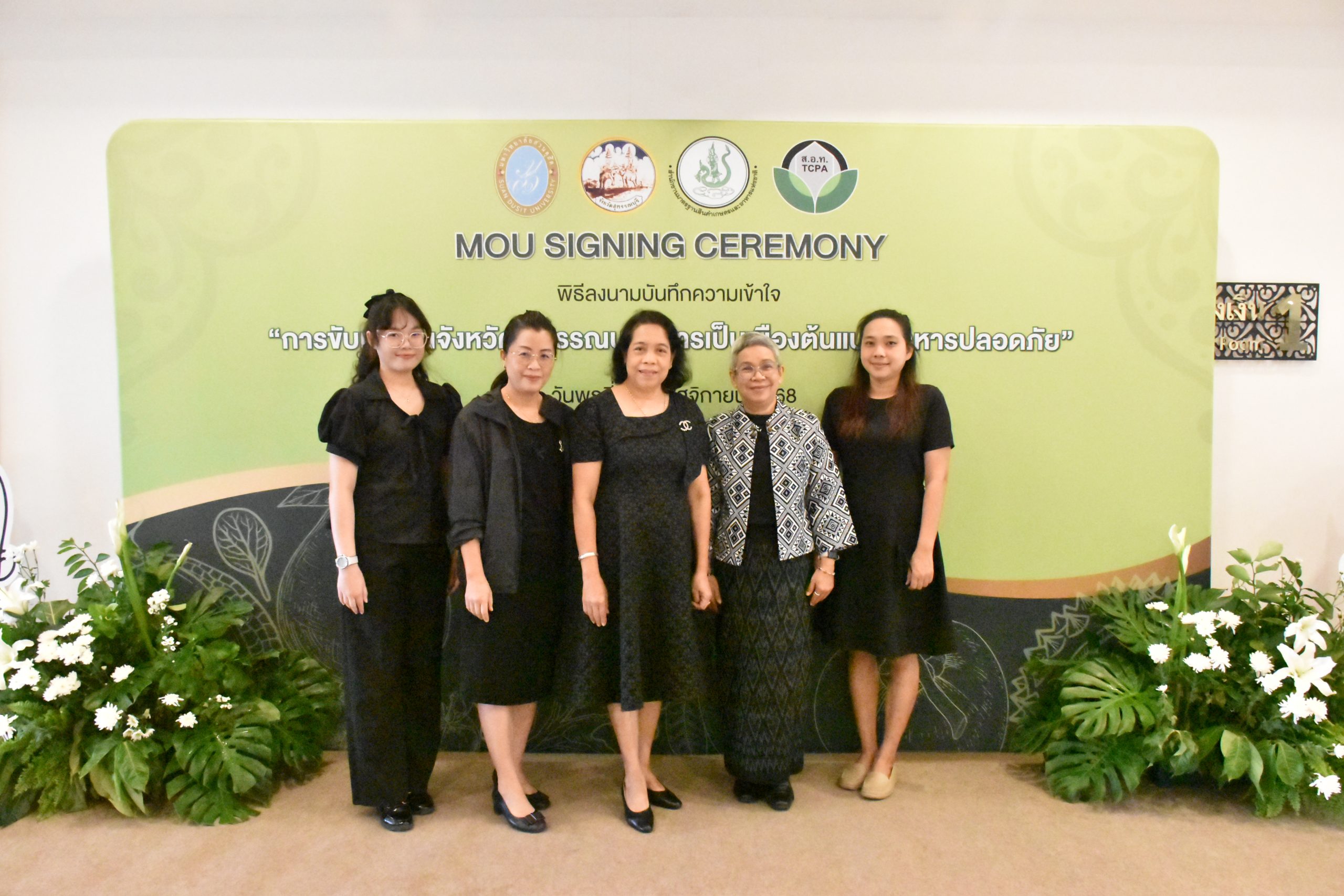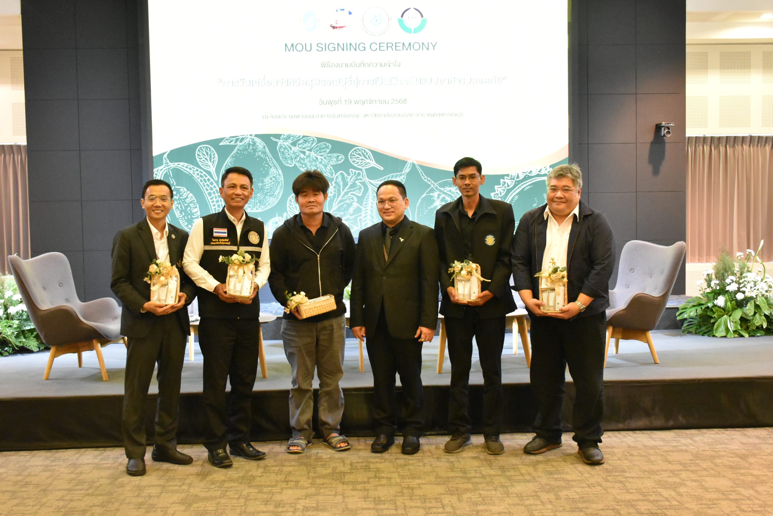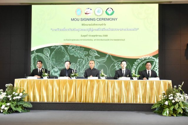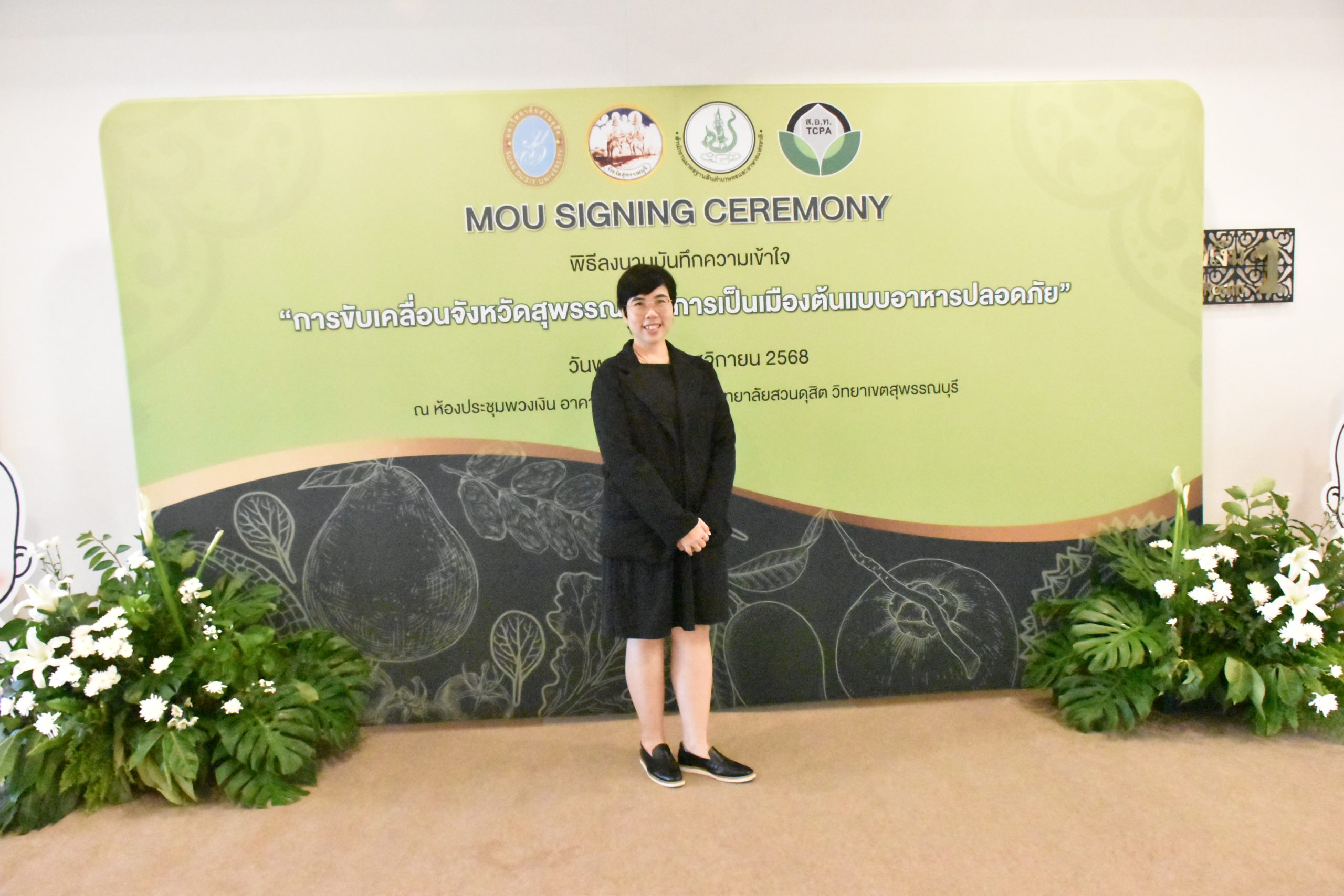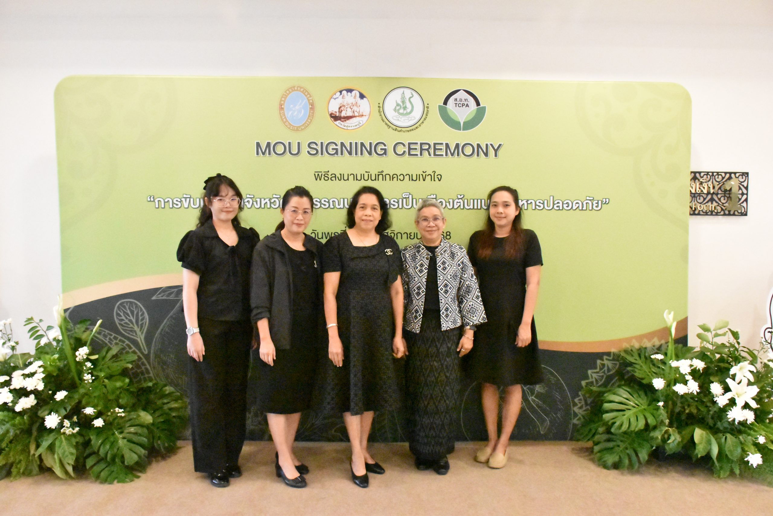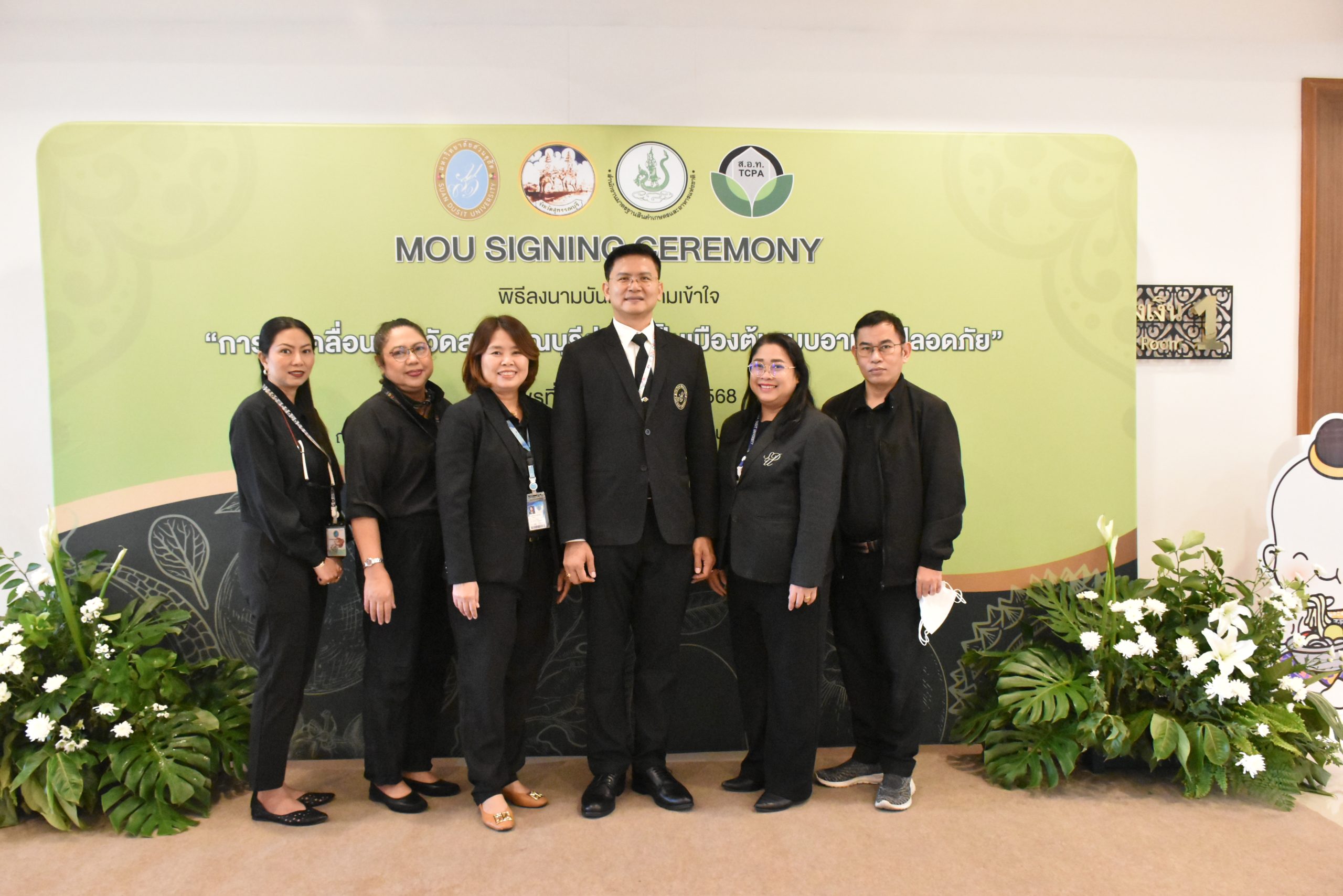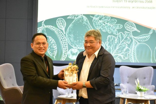 มหาวิทยาลัยสวนดุสิต วิทยาเขตสุพรรณบุรี นำโดย นางกัณณ์อลิน สุอังคะวาทิน ผู้อำนวยการสำนักงานวิทยาเขตสุพรรณบุรี และ นางสาวจุฑารัตน์ จิ๋วสง่า ผู้อำนวยการกองกลาง พร้อมบุคลากร ให้การต้อนรับ สำนักนวัตกรรมชุมชน มหาวิทยาลัยสวนดุสิต ในการจัดพิธีลงนามบันทึกความเข้าใจในการขับเคลื่อนจังหวัดสุพรรณบุรีสู่การเป็นเมืองต้นแบบอาหารปลอดภัย ระหว่างมหาวิทยาลัยสวนดุสิตกับสำนักงานมาตรฐานสินค้าเกษตรและอาหารแห่งชาติ สมาคมอารักขาพืชไทย และจังหวัดสุพรรณบุรี โดยได้รับเกียรติจาก นายณัฐพงษ์ สงวนจิตร ผู้ว่าราชการจังหวัดสุพรรณบุรี ดร.พงศ์ไท ไทโยธิน รองเลขาธิการ มกอช. นายสมศักดิ์ สมานวงศ์ นายกสมาคม อารักขาพืชไทย ผู้ช่วยศาสตราจารย์ ดร.พิทักษ์ จันทร์เจริญ อธิการบดี มหาวิทยาลัยสวนดุสิต และรองศาสตราจารย์ ดร.ชนะศึก นิชานนท์ รองอธิการบดีฝ่ายบริหารวิจัย และนวัตกรรม มหาวิทยาลัยสวนดุสิต ให้เกียรติเข้าร่วมลงในฐานะตัวแทนของหน่วยงาน โดยมีหัวหน้าส่วนราชการ ผู้บริหารมหาวิทยาลัย บุคลากร นักศึกษาและเกษตรกรให้ความสนใจเข้าร่วมเป็นจำนวนมาก นอกจากนี้ ภายในงานยังมีกิจกรรมการจัดแสดงบูธนิทรรศการสินค้าเกษตรและสินค้าแปรรูปที่ได้รับการรับรองมาตรฐานเกษตรปลอดภัย (GAP) และมาตรฐานแบรนด์น้องเหน่อของจังหวัดสุพรรณบุรี จำนวน 15 บูธ ตลอดจนกิจกรรมการเสวนาภายใต้โครงการ “การยกระดับห่วงโซ่คุณค่าปลาสลิดดอนกำยานเพื่อขับเคลื่อนเศรษฐกิจสร้างสรรค์” ในวันพุธที่ 19 พฤศจิกายน 2568 เวลา 09.00-15.00 น. ณ ห้องประชุมพวงเงิน ศูนย์ฝึกปฏิบัติการอาหารมุสลิม (อาคารจันทร์เจริญ) มหาวิทยาลัยสวนดุสิต วิทยาเขตสุพรรณบุรี