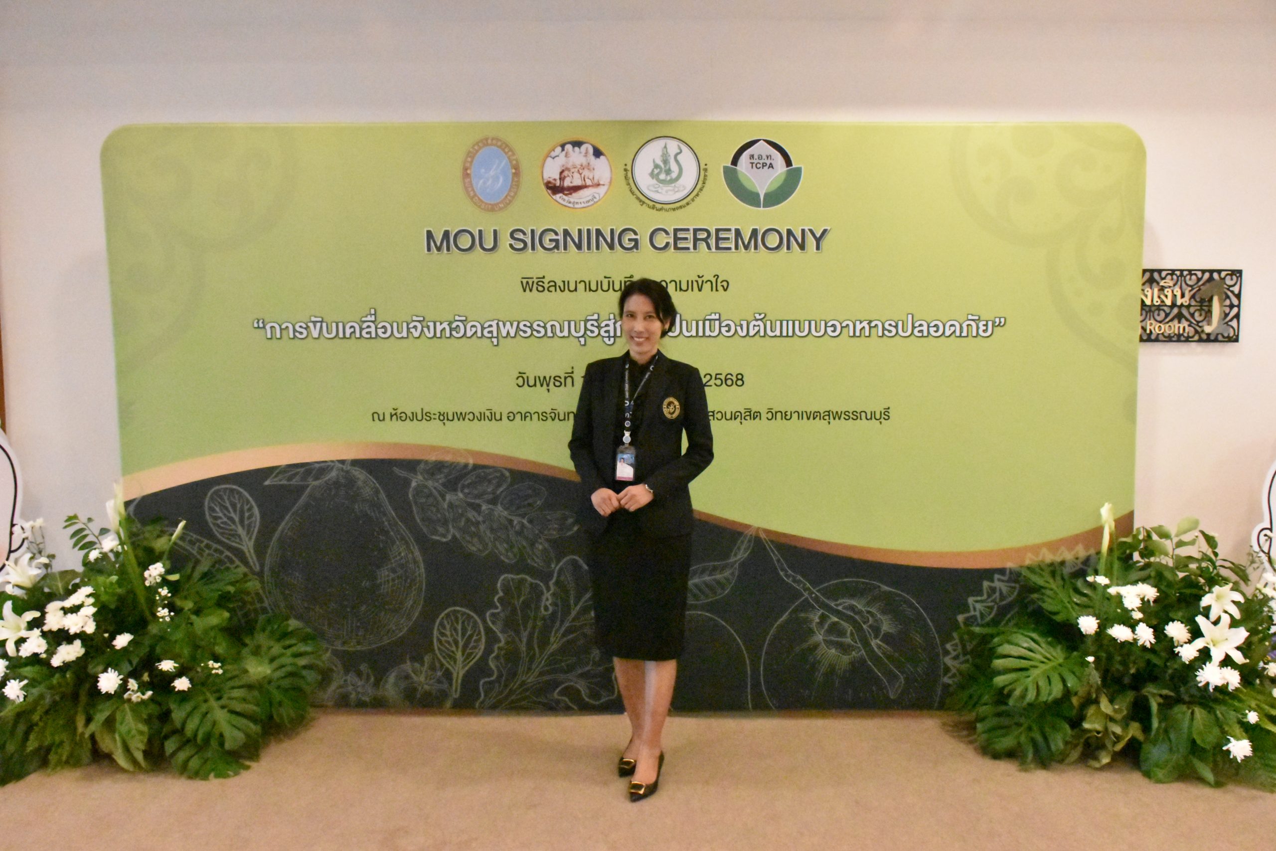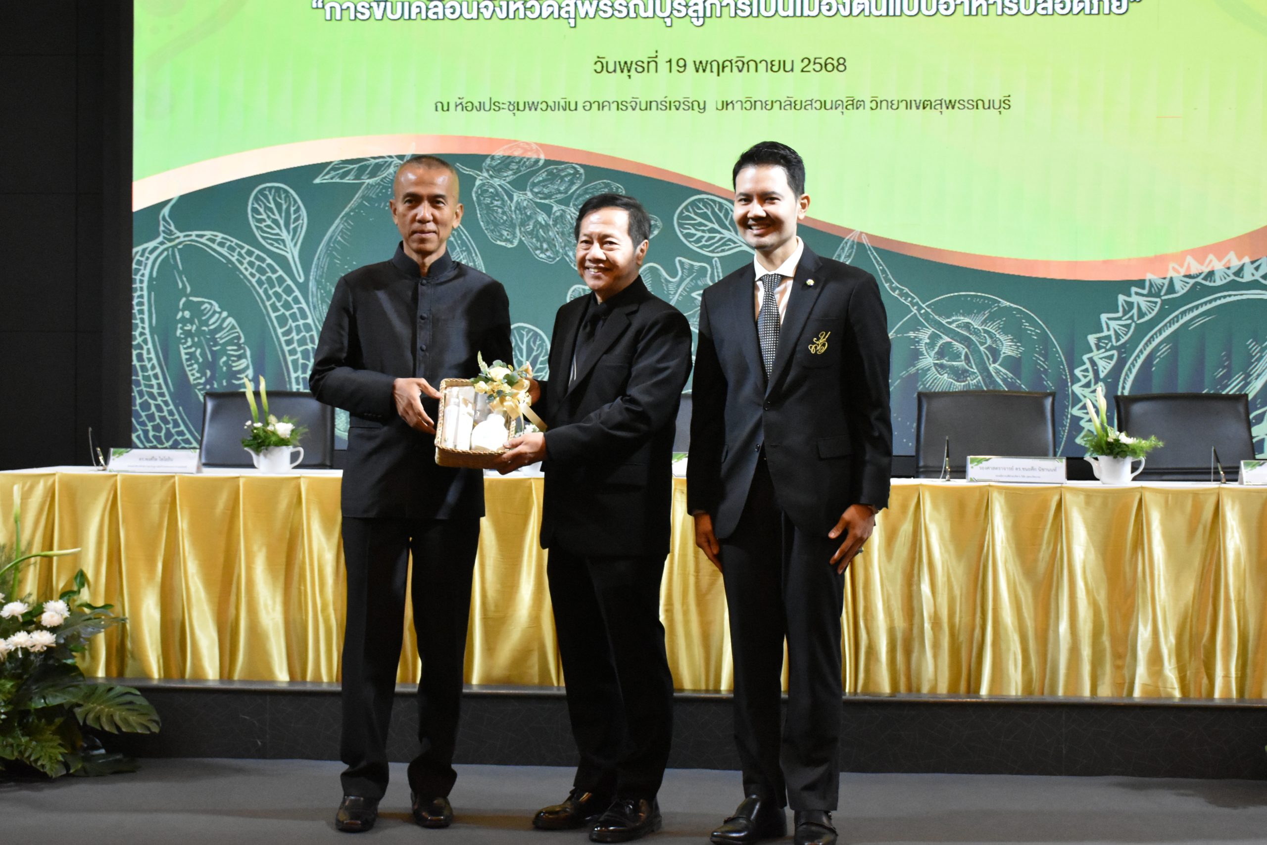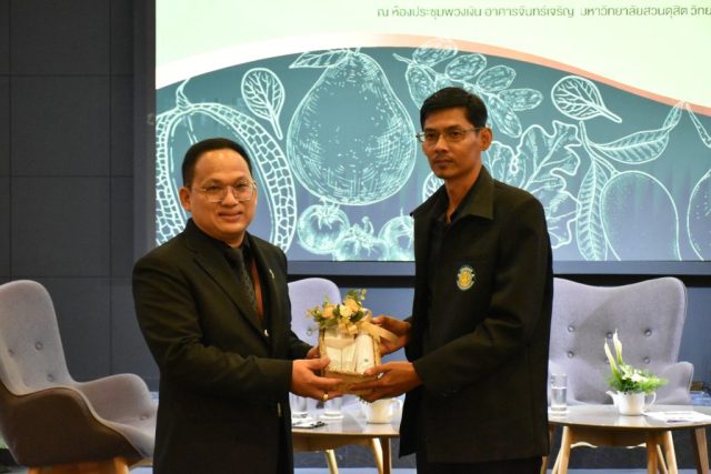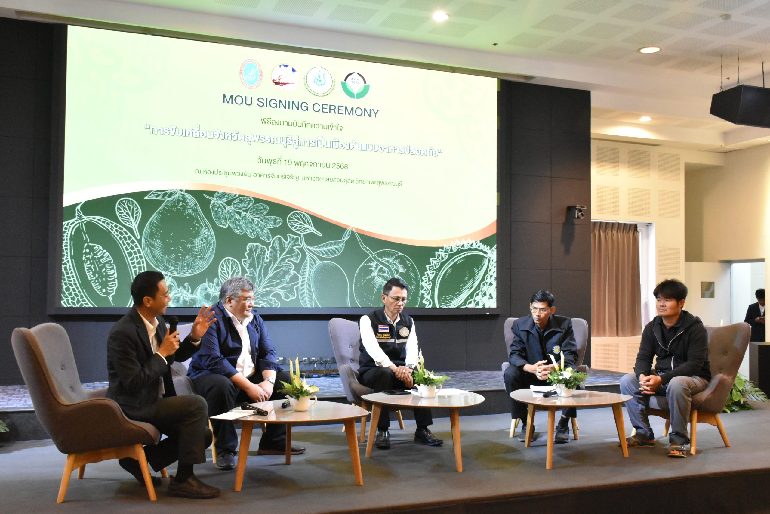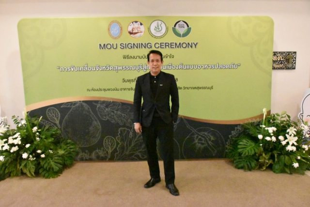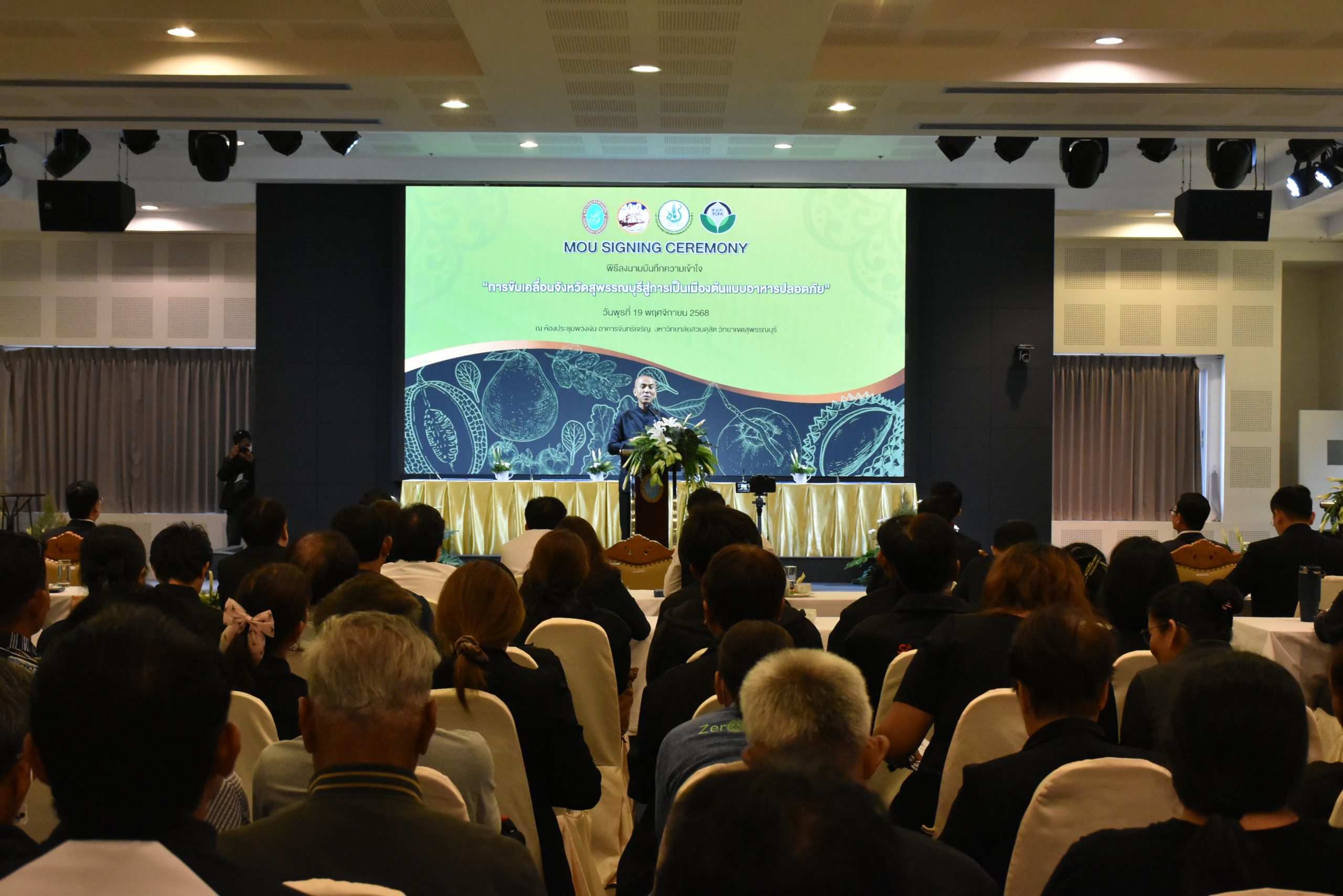 มหาวิทยาลัยสวนดุสิต วิทยาเขตสุพรรณบุรี นำโดย นางกัณณ์อลิน สุอังคะวาทิน ผู้อำนวยการสำนักงานวิทยาเขตสุพรรณบุรี และ นางสาวจุฑารัตน์ จิ๋วสง่า ผู้อำนวยการกองกลาง พร้อมบุคลากร ให้การต้อนรับ สำนักนวัตกรรมชุมชน มหาวิทยาลัยสวนดุสิต ในการจัดพิธีลงนามบันทึกความเข้าใจในการขับเคลื่อนจังหวัดสุพรรณบุรีสู่การเป็นเมืองต้นแบบอาหารปลอดภัย ระหว่างมหาวิทยาลัยสวนดุสิตกับสำนักงานมาตรฐานสินค้าเกษตรและอาหารแห่งชาติ สมาคมอารักขาพืชไทย และจังหวัดสุพรรณบุรี โดยได้รับเกียรติจาก นายณัฐพงษ์ สงวนจิตร ผู้ว่าราชการจังหวัดสุพรรณบุรี ดร.พงศ์ไท ไทโยธิน รองเลขาธิการ มกอช. นายสมศักดิ์ สมานวงศ์ นายกสมาคม อารักขาพืชไทย ผู้ช่วยศาสตราจารย์ ดร.พิทักษ์ จันทร์เจริญ อธิการบดี มหาวิทยาลัยสวนดุสิต และรองศาสตราจารย์ ดร.ชนะศึก นิชานนท์ รองอธิการบดีฝ่ายบริหารวิจัย และนวัตกรรม มหาวิทยาลัยสวนดุสิต ให้เกียรติเข้าร่วมลงในฐานะตัวแทนของหน่วยงาน โดยมีหัวหน้าส่วนราชการ ผู้บริหารมหาวิทยาลัย บุคลากร นักศึกษาและเกษตรกรให้ความสนใจเข้าร่วมเป็นจำนวนมาก นอกจากนี้ ภายในงานยังมีกิจกรรมการจัดแสดงบูธนิทรรศการสินค้าเกษตรและสินค้าแปรรูปที่ได้รับการรับรองมาตรฐานเกษตรปลอดภัย (GAP) และมาตรฐานแบรนด์น้องเหน่อของจังหวัดสุพรรณบุรี จำนวน 15 บูธ ตลอดจนกิจกรรมการเสวนาภายใต้โครงการ “การยกระดับห่วงโซ่คุณค่าปลาสลิดดอนกำยานเพื่อขับเคลื่อนเศรษฐกิจสร้างสรรค์” ในวันพุธที่ 19 พฤศจิกายน 2568 เวลา 09.00-15.00 น. ณ ห้องประชุมพวงเงิน ศูนย์ฝึกปฏิบัติการอาหารมุสลิม (อาคารจันทร์เจริญ) มหาวิทยาลัยสวนดุสิต วิทยาเขตสุพรรณบุรี