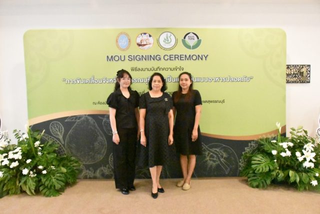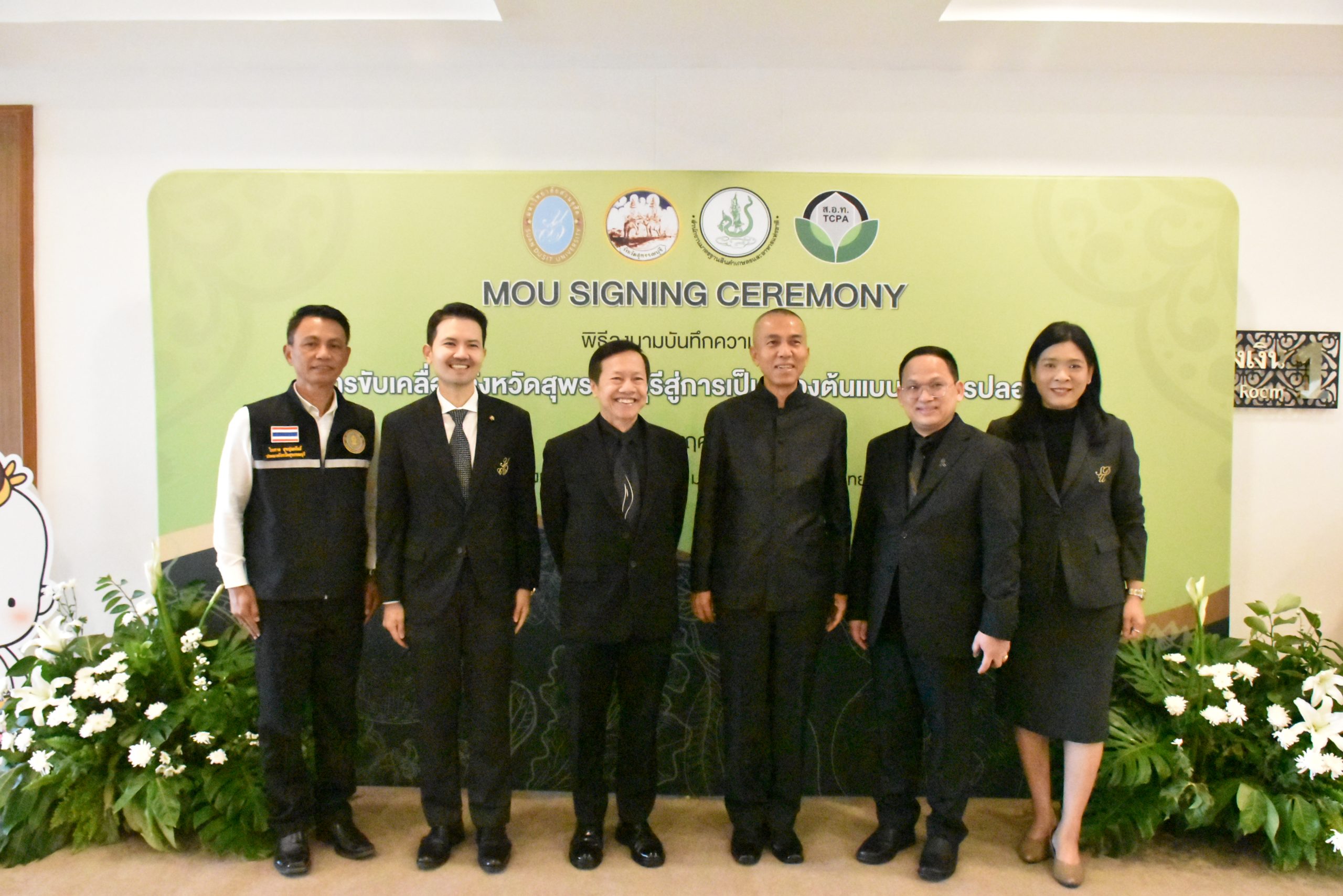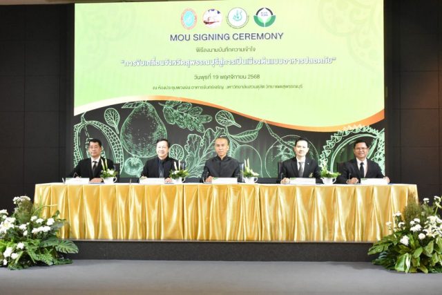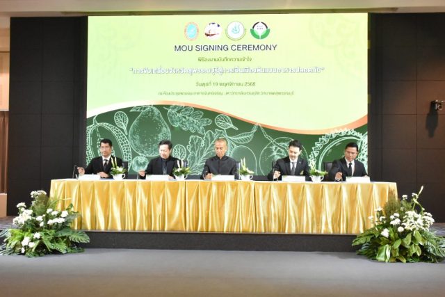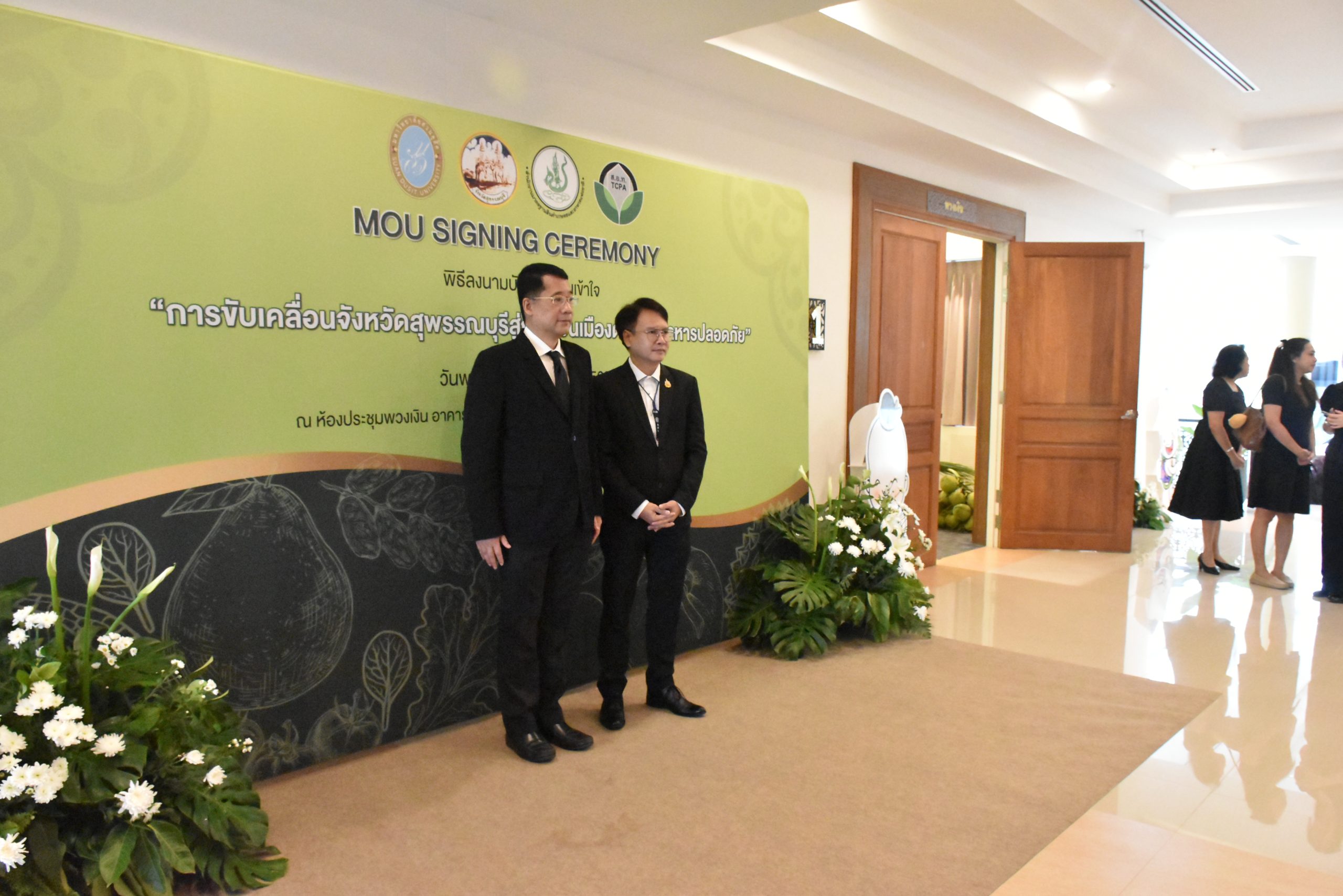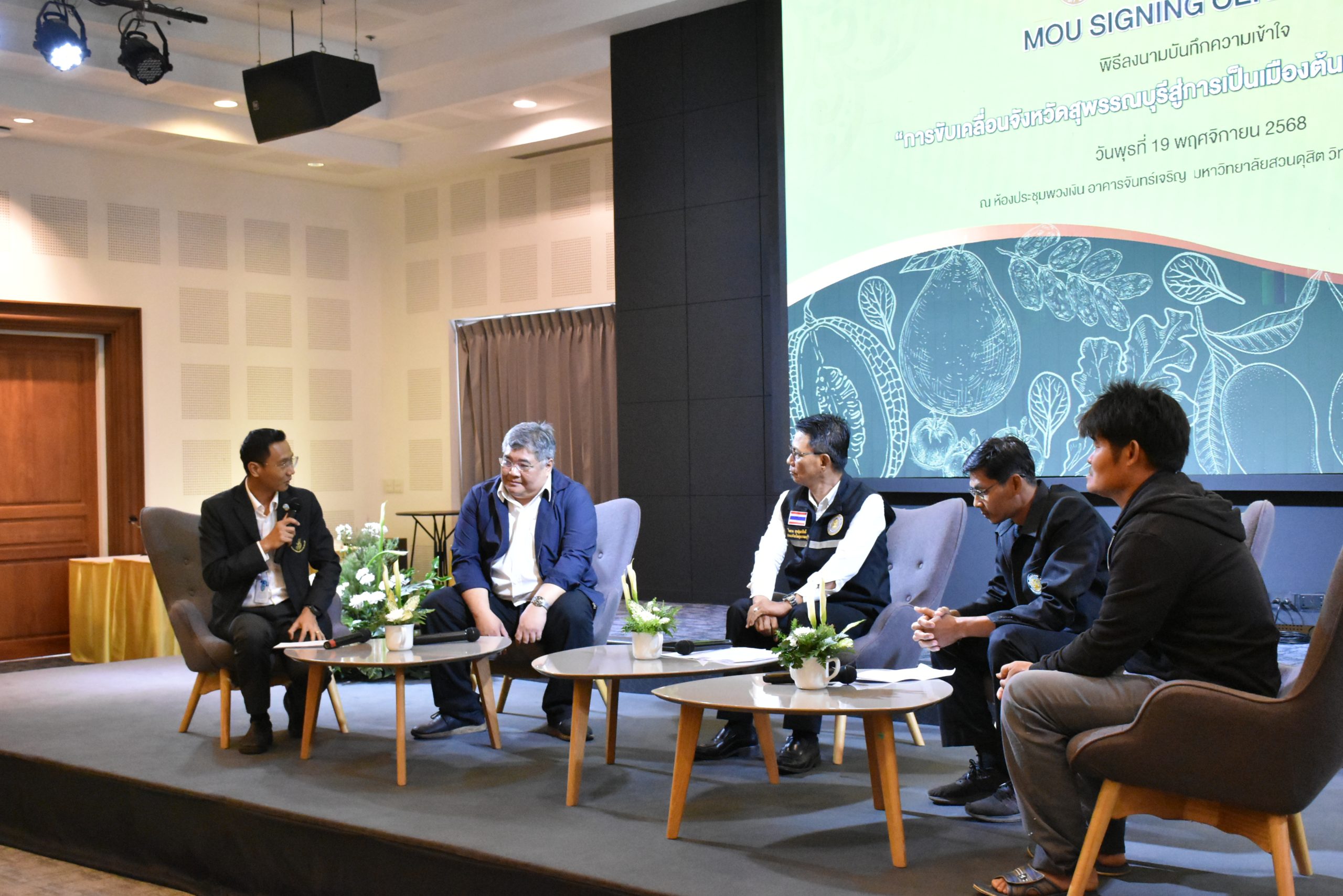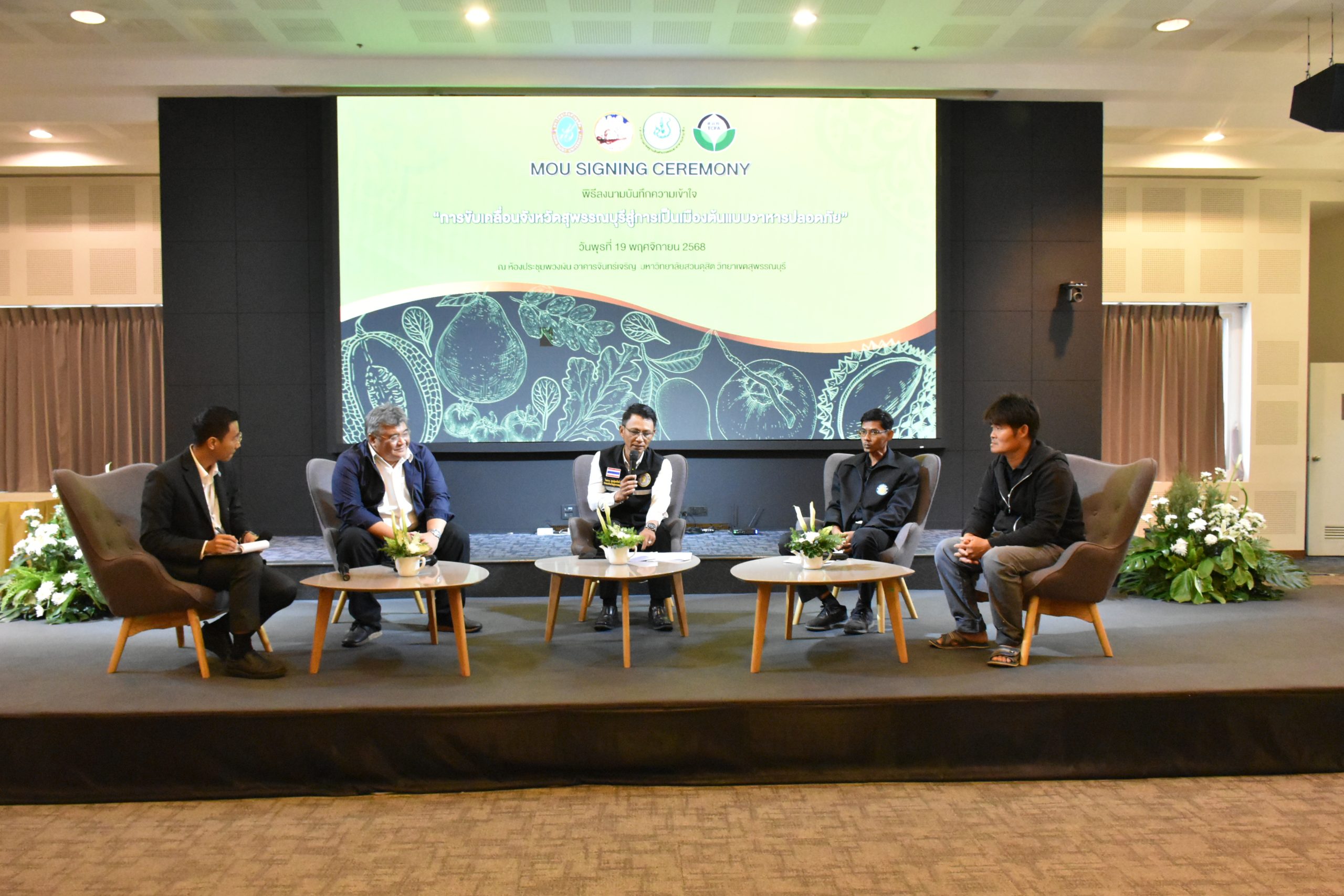 มหาวิทยาลัยสวนดุสิต วิทยาเขตสุพรรณบุรี นำโดย นางกัณณ์อลิน สุอังคะวาทิน ผู้อำนวยการสำนักงานวิทยาเขตสุพรรณบุรี และ นางสาวจุฑารัตน์ จิ๋วสง่า ผู้อำนวยการกองกลาง พร้อมบุคลากร ให้การต้อนรับ สำนักนวัตกรรมชุมชน มหาวิทยาลัยสวนดุสิต ในการจัดพิธีลงนามบันทึกความเข้าใจในการขับเคลื่อนจังหวัดสุพรรณบุรีสู่การเป็นเมืองต้นแบบอาหารปลอดภัย ระหว่างมหาวิทยาลัยสวนดุสิตกับสำนักงานมาตรฐานสินค้าเกษตรและอาหารแห่งชาติ สมาคมอารักขาพืชไทย และจังหวัดสุพรรณบุรี โดยได้รับเกียรติจาก นายณัฐพงษ์ สงวนจิตร ผู้ว่าราชการจังหวัดสุพรรณบุรี ดร.พงศ์ไท ไทโยธิน รองเลขาธิการ มกอช. นายสมศักดิ์ สมานวงศ์ นายกสมาคม อารักขาพืชไทย ผู้ช่วยศาสตราจารย์ ดร.พิทักษ์ จันทร์เจริญ อธิการบดี มหาวิทยาลัยสวนดุสิต และรองศาสตราจารย์ ดร.ชนะศึก นิชานนท์ รองอธิการบดีฝ่ายบริหารวิจัย และนวัตกรรม มหาวิทยาลัยสวนดุสิต ให้เกียรติเข้าร่วมลงในฐานะตัวแทนของหน่วยงาน โดยมีหัวหน้าส่วนราชการ ผู้บริหารมหาวิทยาลัย บุคลากร นักศึกษาและเกษตรกรให้ความสนใจเข้าร่วมเป็นจำนวนมาก นอกจากนี้ ภายในงานยังมีกิจกรรมการจัดแสดงบูธนิทรรศการสินค้าเกษตรและสินค้าแปรรูปที่ได้รับการรับรองมาตรฐานเกษตรปลอดภัย (GAP) และมาตรฐานแบรนด์น้องเหน่อของจังหวัดสุพรรณบุรี จำนวน 15 บูธ ตลอดจนกิจกรรมการเสวนาภายใต้โครงการ “การยกระดับห่วงโซ่คุณค่าปลาสลิดดอนกำยานเพื่อขับเคลื่อนเศรษฐกิจสร้างสรรค์” ในวันพุธที่ 19 พฤศจิกายน 2568 เวลา 09.00-15.00 น. ณ ห้องประชุมพวงเงิน ศูนย์ฝึกปฏิบัติการอาหารมุสลิม (อาคารจันทร์เจริญ) มหาวิทยาลัยสวนดุสิต วิทยาเขตสุพรรณบุรี