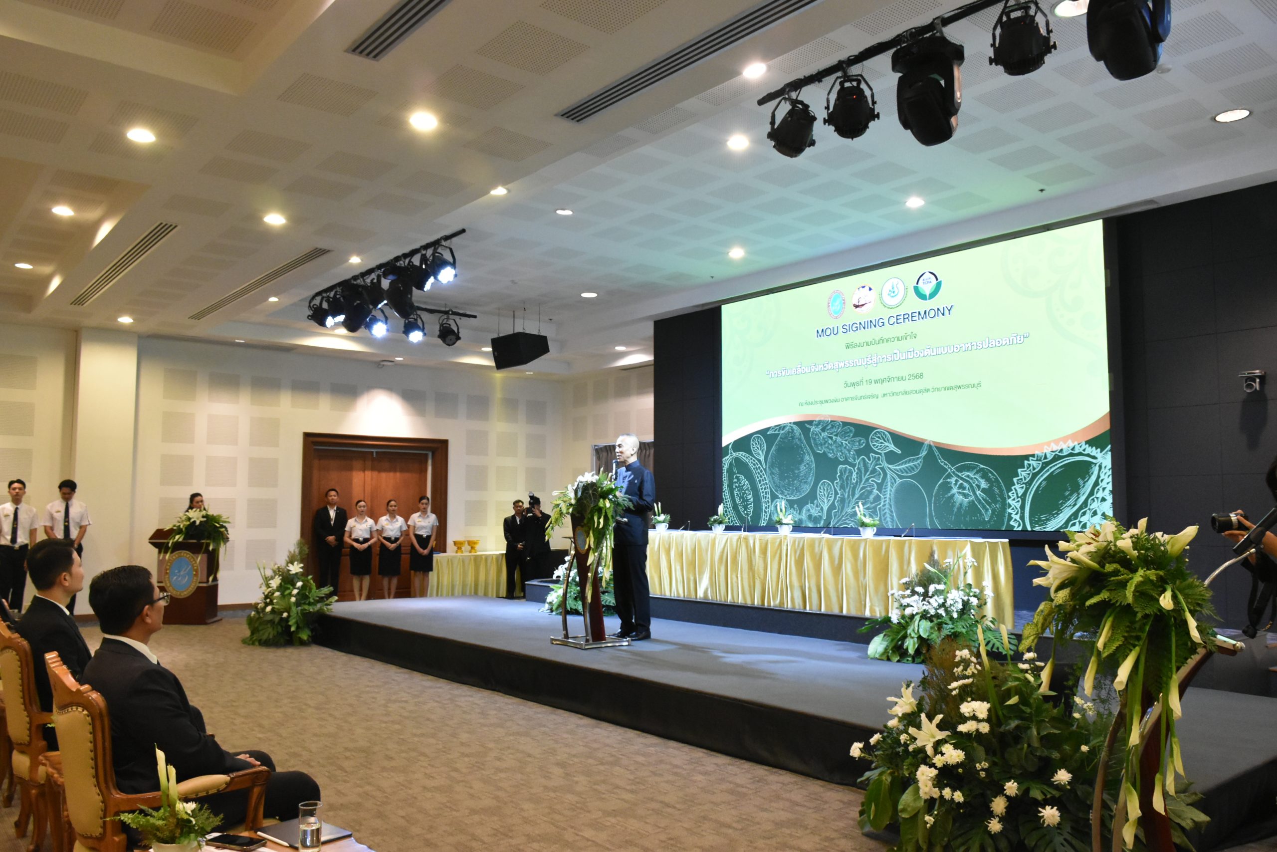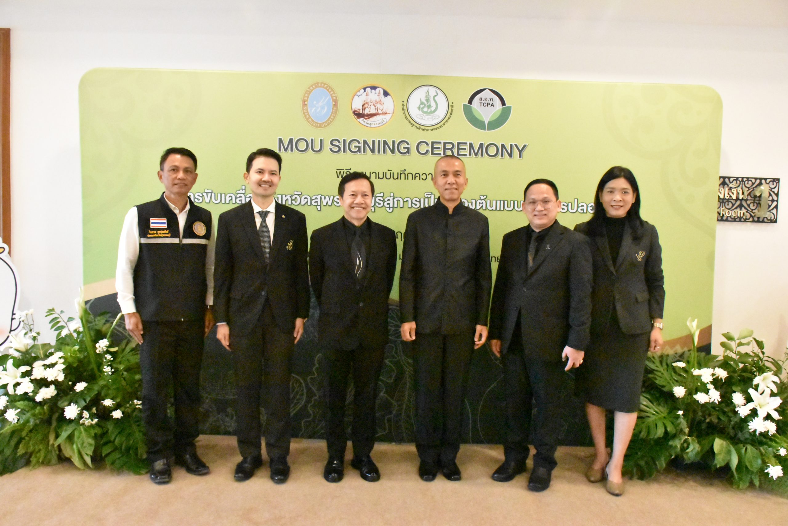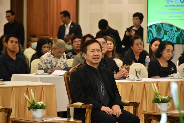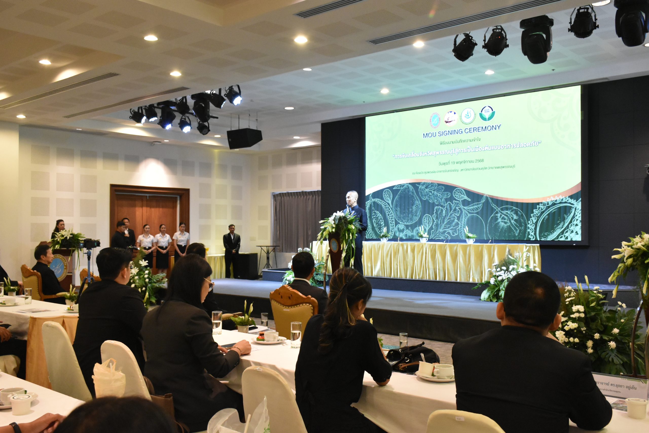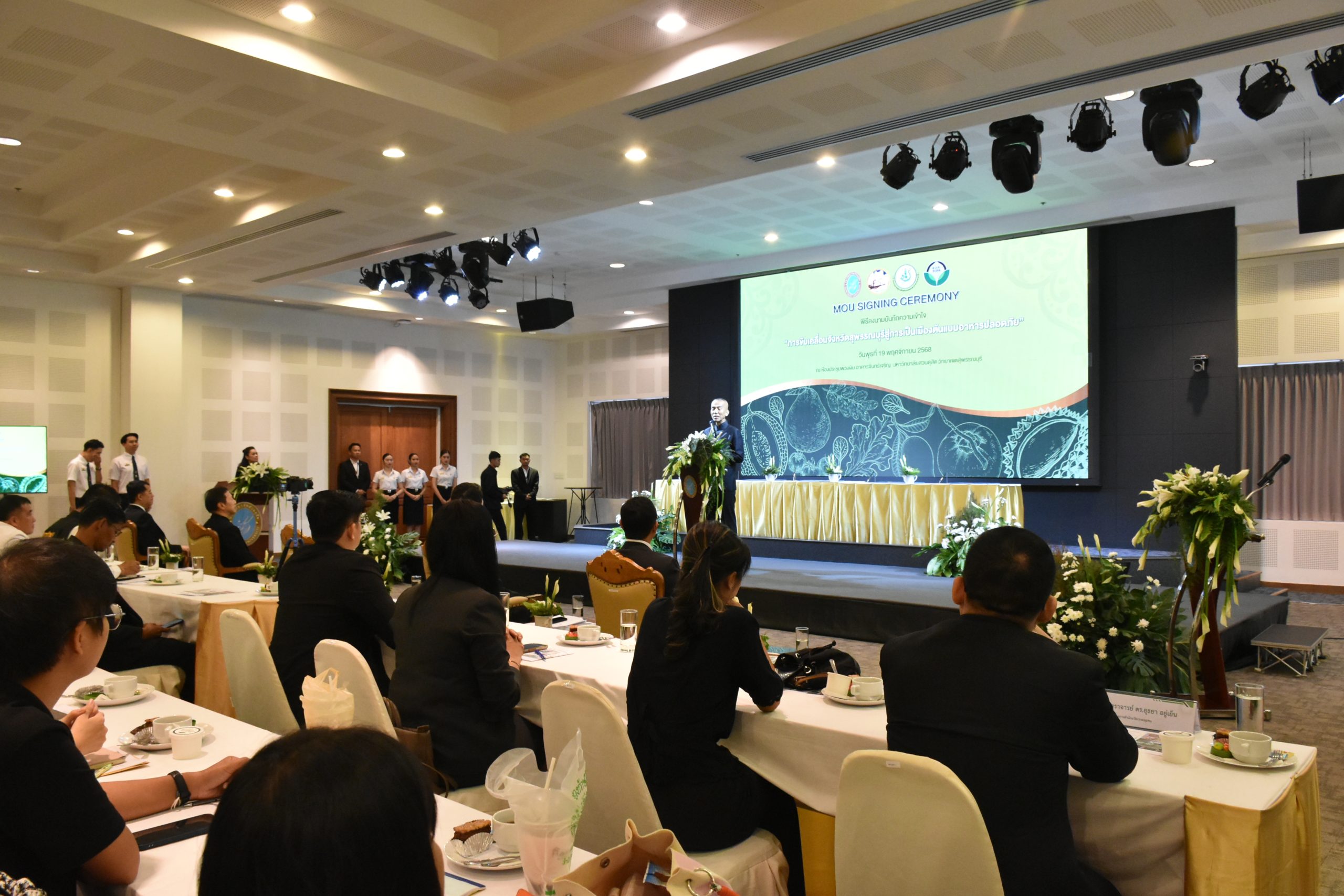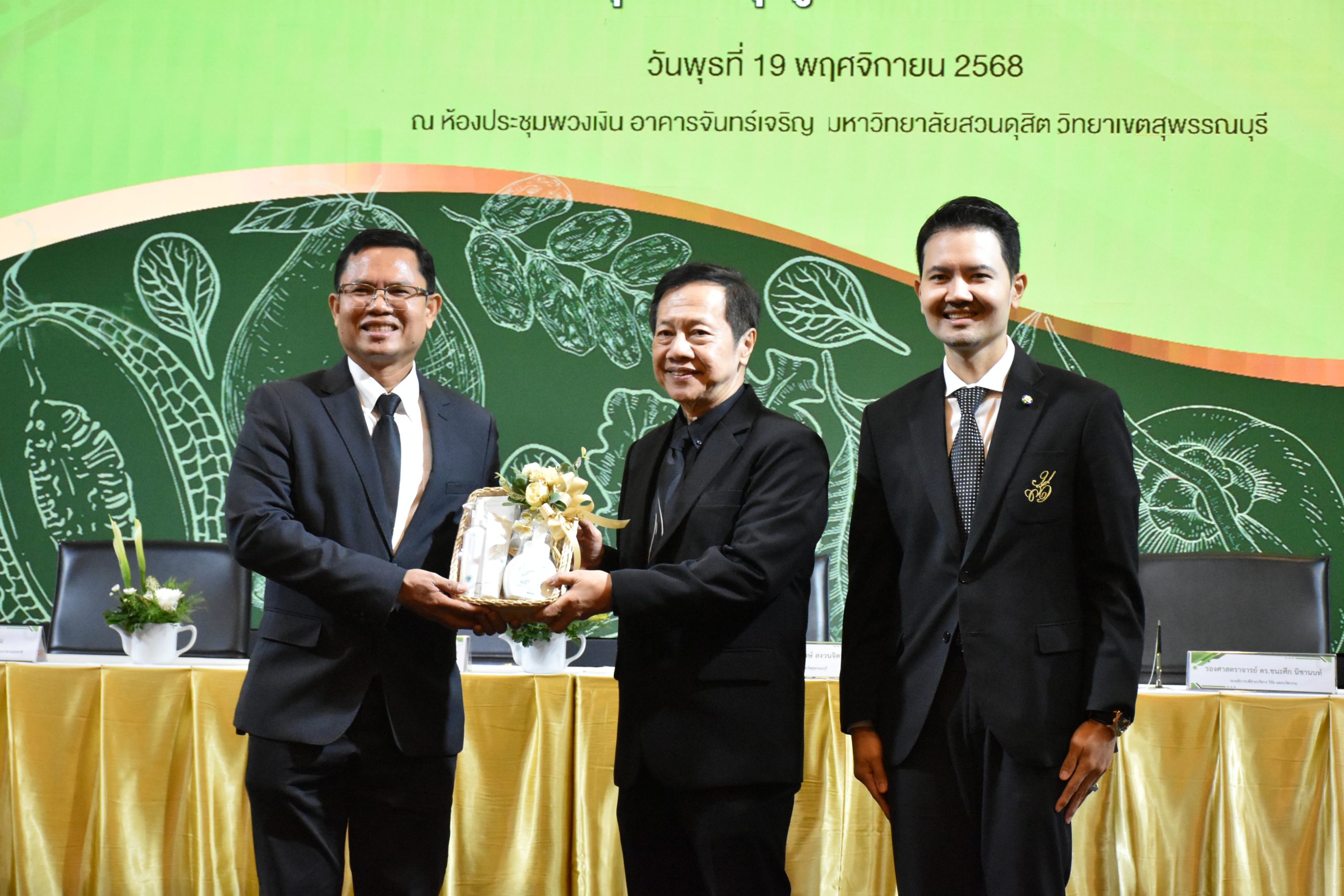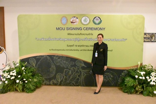 มหาวิทยาลัยสวนดุสิต วิทยาเขตสุพรรณบุรี นำโดย นางกัณณ์อลิน สุอังคะวาทิน ผู้อำนวยการสำนักงานวิทยาเขตสุพรรณบุรี และ นางสาวจุฑารัตน์ จิ๋วสง่า ผู้อำนวยการกองกลาง พร้อมบุคลากร ให้การต้อนรับ สำนักนวัตกรรมชุมชน มหาวิทยาลัยสวนดุสิต ในการจัดพิธีลงนามบันทึกความเข้าใจในการขับเคลื่อนจังหวัดสุพรรณบุรีสู่การเป็นเมืองต้นแบบอาหารปลอดภัย ระหว่างมหาวิทยาลัยสวนดุสิตกับสำนักงานมาตรฐานสินค้าเกษตรและอาหารแห่งชาติ สมาคมอารักขาพืชไทย และจังหวัดสุพรรณบุรี โดยได้รับเกียรติจาก นายณัฐพงษ์ สงวนจิตร ผู้ว่าราชการจังหวัดสุพรรณบุรี ดร.พงศ์ไท ไทโยธิน รองเลขาธิการ มกอช. นายสมศักดิ์ สมานวงศ์ นายกสมาคม อารักขาพืชไทย ผู้ช่วยศาสตราจารย์ ดร.พิทักษ์ จันทร์เจริญ อธิการบดี มหาวิทยาลัยสวนดุสิต และรองศาสตราจารย์ ดร.ชนะศึก นิชานนท์ รองอธิการบดีฝ่ายบริหารวิจัย และนวัตกรรม มหาวิทยาลัยสวนดุสิต ให้เกียรติเข้าร่วมลงในฐานะตัวแทนของหน่วยงาน โดยมีหัวหน้าส่วนราชการ ผู้บริหารมหาวิทยาลัย บุคลากร นักศึกษาและเกษตรกรให้ความสนใจเข้าร่วมเป็นจำนวนมาก นอกจากนี้ ภายในงานยังมีกิจกรรมการจัดแสดงบูธนิทรรศการสินค้าเกษตรและสินค้าแปรรูปที่ได้รับการรับรองมาตรฐานเกษตรปลอดภัย (GAP) และมาตรฐานแบรนด์น้องเหน่อของจังหวัดสุพรรณบุรี จำนวน 15 บูธ ตลอดจนกิจกรรมการเสวนาภายใต้โครงการ “การยกระดับห่วงโซ่คุณค่าปลาสลิดดอนกำยานเพื่อขับเคลื่อนเศรษฐกิจสร้างสรรค์” ในวันพุธที่ 19 พฤศจิกายน 2568 เวลา 09.00-15.00 น. ณ ห้องประชุมพวงเงิน ศูนย์ฝึกปฏิบัติการอาหารมุสลิม (อาคารจันทร์เจริญ) มหาวิทยาลัยสวนดุสิต วิทยาเขตสุพรรณบุรี