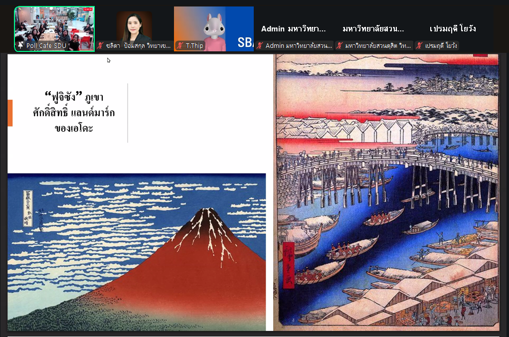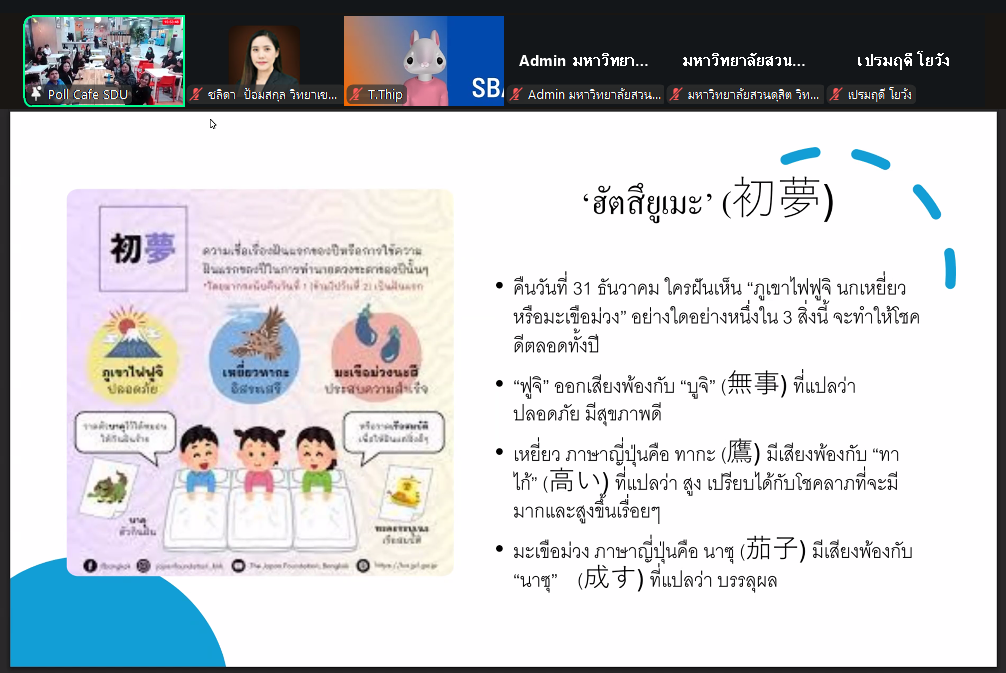 มหาวิทยาลัยสวนดุสิต วิทยาเขตสุพรรณบุรี เข้าร่วมกิจกรรม คุยสบายๆ… Life สาระ ครั้งที่ 396 หัวข้อ มารยาทที่ต้องรู้…ก่อนไปเที่ยวญี่ปุ่น พบกับ รองศาสตราจารย์ ดร.จิรานุช โสภา, อาจารย์ วสันต์ มหากาญจนะ และดร.สมธีราภ์ พรมศิร ซึ่งมีบุคลากรวิทยาเขตสุพรรณบุรี เข้าร่วมกิจกรรมผ่านระบบ Online โปรแกรม Zoom Meeting ในวันพฤหัสบดีที่ 20 พฤศจิกายน 2568 เวลา 15.30 -16.30 น. ณ อาคารศูนย์การเรียนรู้ระบบใหม่โดยใช้เทคโนโลยีเป็นสื่อ (SDU Library) ชั้น 1 โซนกลาง มหาวิทยาลัยสวนดุสิต วิทยาเขตสุพรรณบุรี