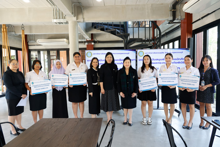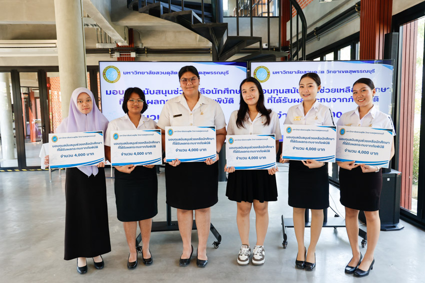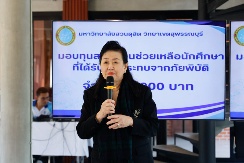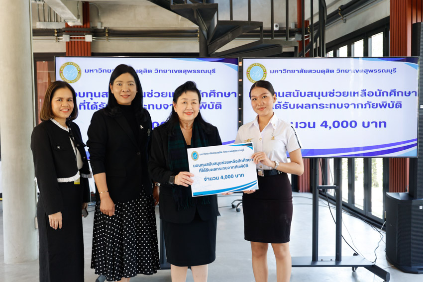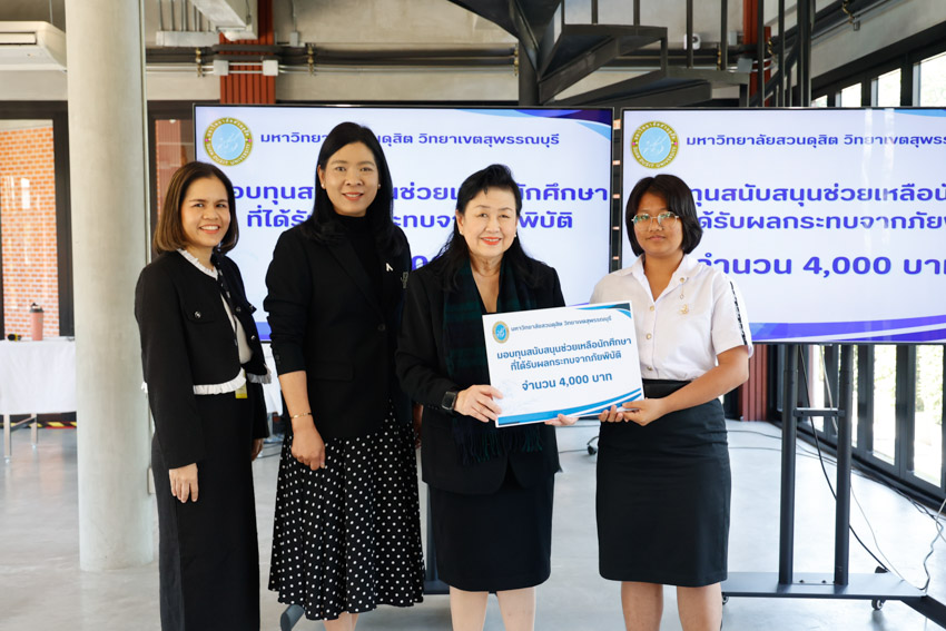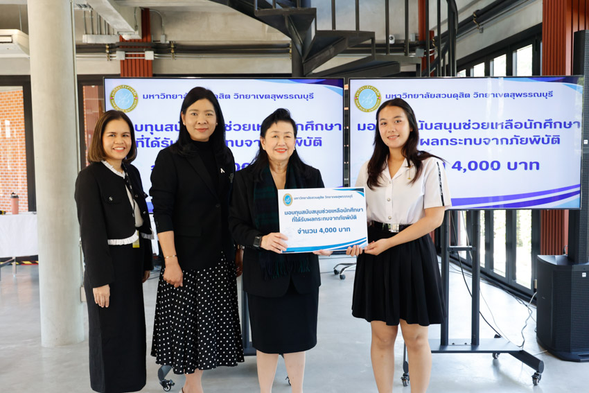 มหาวิทยาลัยสวนดุสิต วิทยาเขตสุพรรณบุรี นำโดย ดร.วรานี เวสสุนทรเทพ รองอธิการบดีฝ่ายวิทยาเขตสุพรรณบุรี พร้อมคณะผู้บริหาร ร่วมมอบทุนช่วยเหลือครอบครัวนักศึกษาที่ได้รับผลกระทบจากสถานการณ์ภัยพิบัติ อุทกภัย ในพื้นที่ภาคใต้ ทำให้ครอบครัวประสบความเดือดร้อน และได้รับความเสียหายต่อทรัพย์สินและที่พักอาศัย จำนวน 6 ราย รายละ 4,000 บาท เพื่อเป็นการบรรเทาความเดือดร้อนและให้ความช่วยเหลือนักศึกษาในเบื้องต้น ได้แก่ นางสาวสุพรรณิการ์ การดี, นางสาวนูรฟัรฮัน หะมะ, นางสาวพัชรกัญญ์ หนูเกื้อ, นางสาวเขมจิรา พุกชาญค้า, นางสาวอมรรัตน์ แซ่ลิ่ม, และนางสาวภิรมย์ บิลละเต๊ะ ในวันพฤหัสบดีที่ 27 พฤศจิกายน 2568 ณ อาคารศูนย์การเรียนรู้ระบบใหม่โดยใช้เทคโนโลยีเป็นสื่อ (SDU Library) ชั้น 1 โซนกลาง มหาวิทยาลัยสวนดุสิต วิทยาเขตสุพรรณบุรี