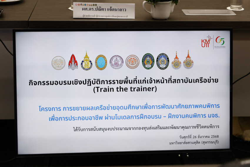 มหาวิทยาลัยเทคโนโลยีพระจอมเกล้าธนบุรี จัดกิจกรรมอบรมเชิงปฏิบัติการรายพื้นที่แก่เจ้าหน้าที่สถาบันเครือข่าย (Train the trainer) ตามโครงการ การขยายผลเครือข่ายอุดมศึกษาเพื่อการพัฒนาศักยภาพคนพิการ เพื่อการประกอบอาชีพ ผ่านโมเดลการฝึกอบรม-ฝึกงานคนพิการ มจธ. โดยมหาวิทยาลัยสวนดุสิต วิทยาเขตสุพรรณบุรี นำโดย ดร.วรานี เวสสุนทรเทพ รองอธิการบดีฝ่ายวิทยาเขตสุพรรณบุรี พร้อมคณะผู้บริหารและบุคลากรในส่วนงานที่เกี่ยวข้อง และสถาบันเครือข่าย เข้าร่วมกิจกรรม ในวันศุกร์ที่ 26 ธันวาคม 2568 เวลา 10.00-12.00 น. ณ ห้องประชุมชั้น 3 อาคารศูนย์ความเป็นเลิศด้านการพิมพ์และบรรจุภัณฑ์ มหาวิทยาลัยสวนดุสิต วิทยาเขตสุพรรณบุรี
