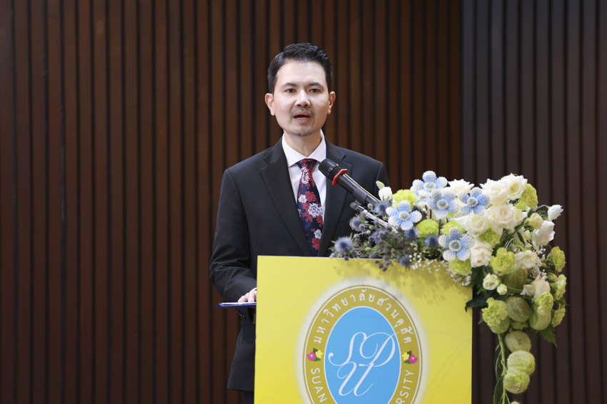 มหาวิทยาลัยสวนดุสิต วิทยาเขตสุพรรณบุรี นำโดย ดร.วรานี เวสสุนทรเทพ รองอธิการบดีฝ่ายวิทยาเขตสุพรรณบุรี พร้อมด้วย นางกัณณ์อลิน สุอังคะวาทิน ผู้อำนวยการสำนักงานวิทยาเขตสุพรรณบุรี และบุคลากรวิทยาเขตสุพรรณบุรี ร่วมงานในโอกาส นายศุภชัย ใจสมุทร ผู้ช่วยรัฐมนตรีประจำกระทรวงการอุดมศึกษา วิทยาศาสตร์ วิจัยและนวัตกรรม ลงพื้นที่ติดตามการดำเนินงานขับเคลื่อนงานด้าน อววน. ในพื้นที่กรุงเทพมหานคร โดยมีผู้ช่วยศาสตราจารย์ ดร.พิทักษ์ จันทร์เจริญ อธิการบดีมหาวิทยาลัยสวนดุสิต กล่าวต้อนรับ และ รองศาสตราจารย์ ดร.ชนะศึก นิชานนท์ รองอธิการบดีฝ่ายบริหาร วิจัย และนวัตกรรม กล่าวรายงานการดำเนินงานของมหาวิทยาลัย เพื่อการยกระดับการท่องเที่ยวและบริการ ทั้งนี้ นายศุภชัย ใจสมุทร ผู้ช่วยรัฐมนตรีประจำกระทรวงการอุดมศึกษา วิทยาศาสตร์ วิจัยและนวัตกรรม ให้เกียรติกล่าวมอบนโยบาย “การขับเคลื่อนการพัฒนาอุตสาหกรรมการท่องเที่ยวและบริการ” พร้อมกับเปิดงาน Realm of Flavor: Inspiring the Future of Global Tourism and Hospitality อาณาจักรแห่งรสชาติ: จุดประกายอนาคตการท่องเที่ยวและการบริการระดับโลก และได้เยี่ยมชมบูธนิทรรศการ “การท่องเที่ยวด้านอาหารและวัตถุดิบท้องถิ่น” ในวันพุธที่ 14 พฤษภาคม 2568 ณ ห้องประชุม Hall 2 อาคารเฉลิมพระเกียรติ 50 พรรษา มหาวชิราลงกรณ ศูนย์วิทยาศาสตร์ มหาวิทยาลัยสวนดุสิต