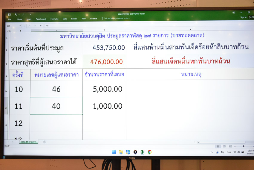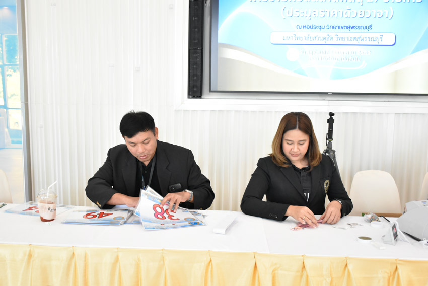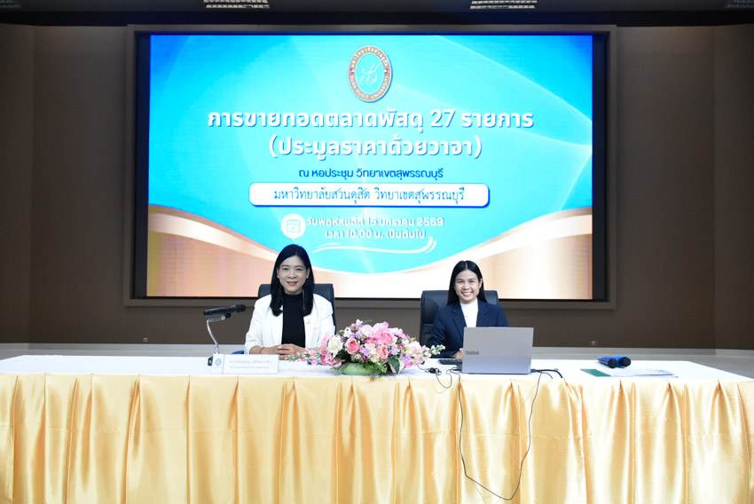กองกลาง สำนักงานวิทยาเขตสุพรรณบุรี มหาวิทยาลัยสวนดุสิต ดำเนินการขายทอดตลาดพัสดุ จำนวน 27 รายการ โดยวิธีประมูลราคาด้วยวาจา โดยมี นางกัณณ์อลิน สุอังคะวาทิน ผู้อำนวยการสำนักงานวิทยาเขตสุพรรณบุรี แจ้งประกาศข้อกำหนดสำคัญในการประมูล และเป็นผู้ดำเนินการประมูล โดยมี นางสาวจุฑารัตน์ จิ๋วสง่า ผู้อำนวยการกองกลาง, นายปริญญา หนูนุรัตน์ ผู้อำนวยการกองอาคารและสิ่งแวดล้อม พร้อมคณะกรรมการฯ ร่วมสังเกตุการณ์ และอำนวยความสะดวก ในการดำเนินงาน โดยมีผู้ให้ความสนใจเข้าร่วมการประมูล จำนวน 41 ราย ในวันพฤหัสบดีที่ 15 มกราคม 2569 เวลา 09.00-12.00 น. ณ หอประชุมมหาวิทยาลัยสวนดุสิต วิทยาเขตสุพรรณบุรี