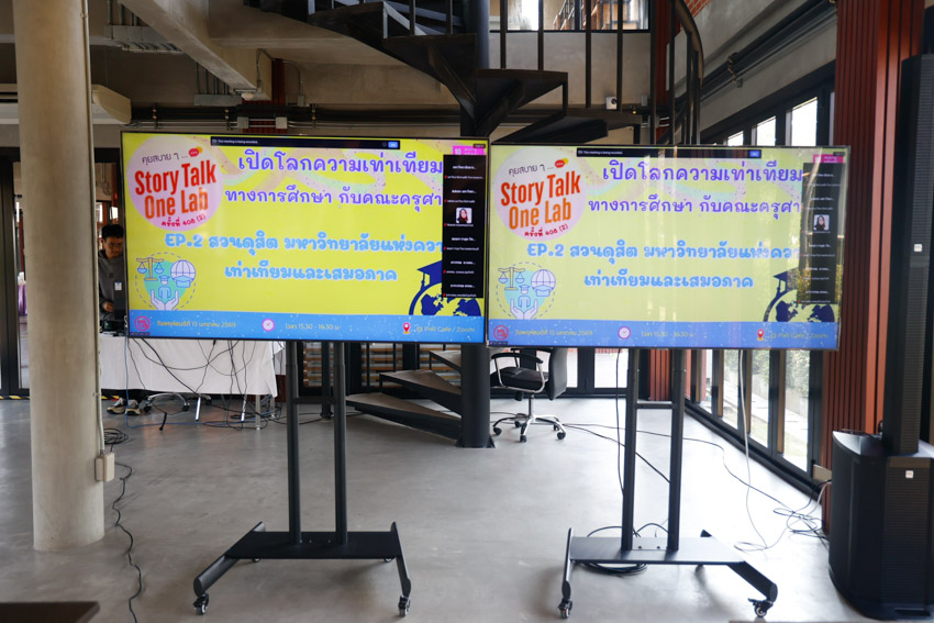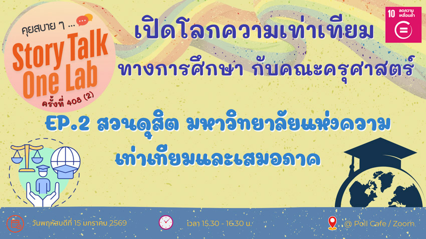 มหาวิทยาลัยสวนดุสิต วิทยาเขตสุพรรณบุรี เข้าร่วมกิจกรรม “คุยสบายๆ… Story Talk One Lab“ ครั้งที่ 408 (2) ประจำเดือนมกราคม Concept: “เปิดโลกความเท่าเทียมทางการศึกษา” กับคณะครุศาสตร์ มหาวิทยาลัยสวนดุสิต EP.2 “สวนดุสิต มหาวิทยาลัย แห่งความเท่าเทียมและเสมอภาค” พบกับ รองศาสตราจารย์ ดร.กรรวิภาร์ หงษ์งาม : อาจารย์ศูนย์การศึกษาพิเศษ และ คุณกาญจนา ผิวงาม : ล่ามภาษามือ ฝ่ายบริการสนับสนุนนักศึกษาพิการเรียนร่วม โดยวิทยาเขตสุพรรณบุรี เข้าร่วมกิจกรรมผ่านระบบ Online โปรแกรม Zoom Meeting ในวันพฤหัสบดีที่ 15 มกราคม 2569 เวลา 15.30-16.30 น. ณ อาคารศูนย์การเรียนรู้ระบบใหม่โดยใช้เทคโนโลยีเป็นสื่อ (SDU Library) ชั้น 1 โซนกลาง มหาวิทยาลัยสวนดุสิต วิทยาเขตสุพรรณบุรี