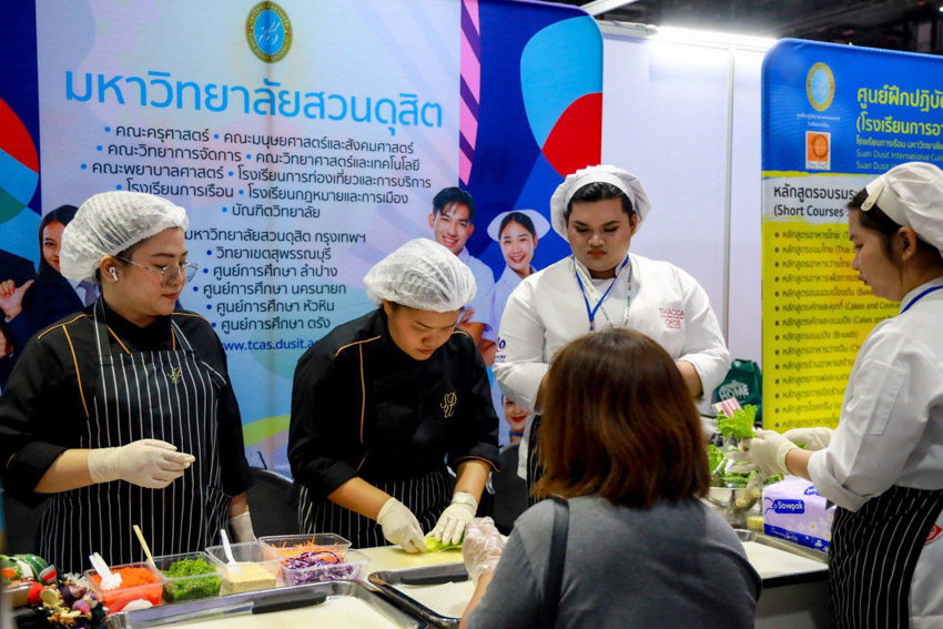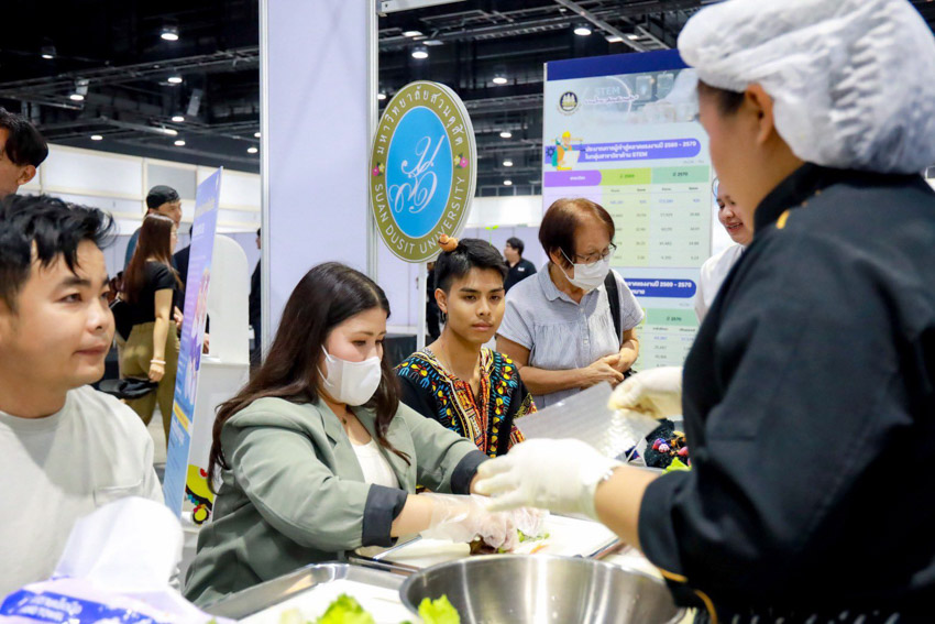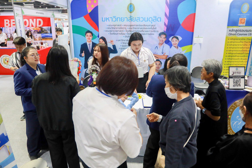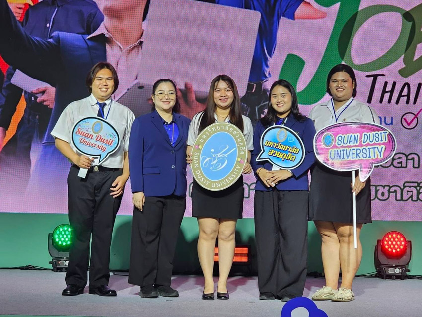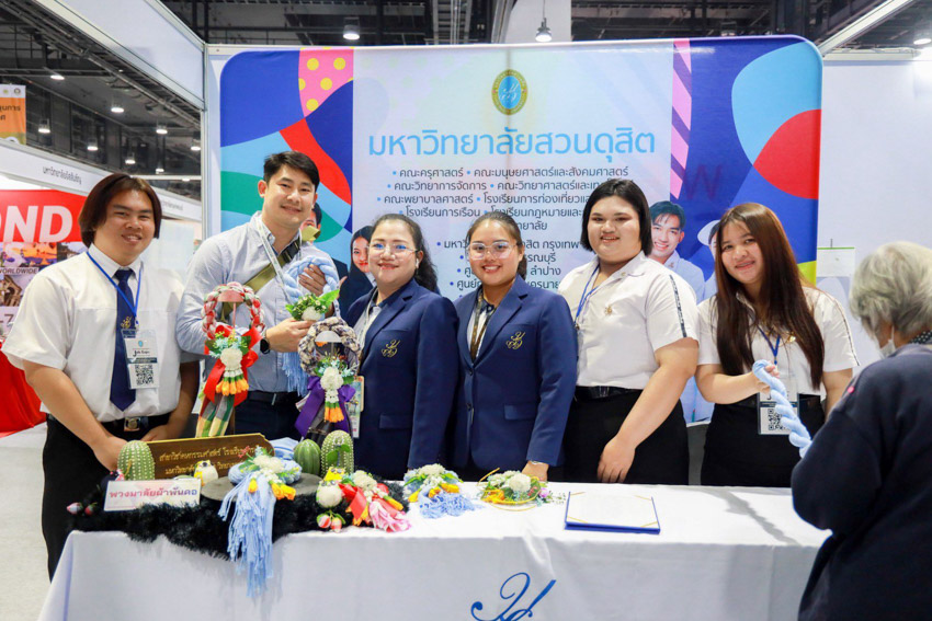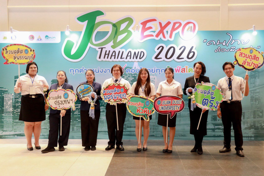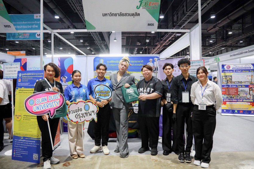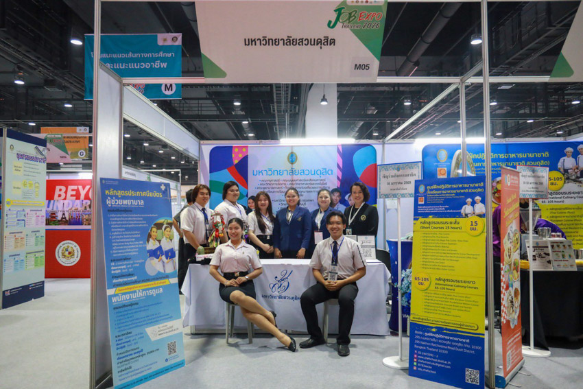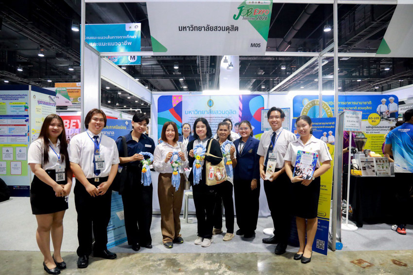 หลักสูตรศิลปศาสตรบัณฑิต สาขาวิชาคหกรรมศาสตร์ โรงเรียนการเรือน มหาวิทยาลัยสวนดุสิต วิทยาเขตสุพรรณบุรี ร่วมออกบูธ สาธิตการทำพวงมาลัยผ้าพันคอ พวงกุญแจผ้าไทย และสอนทำอาหาร สลัดโรล ภายในงาน JOB EXPO THAILAND 2026 ซึ่งจัดขึ้นระหว่างวันที่ 16–18 มกราคม 2569 เวลา 10.00–19.00 น. ณ ฮอลล์ 5–6 ชั้น LG ศูนย์การประชุมแห่งชาติสิริกิติ์ กรุงเทพมหานคร