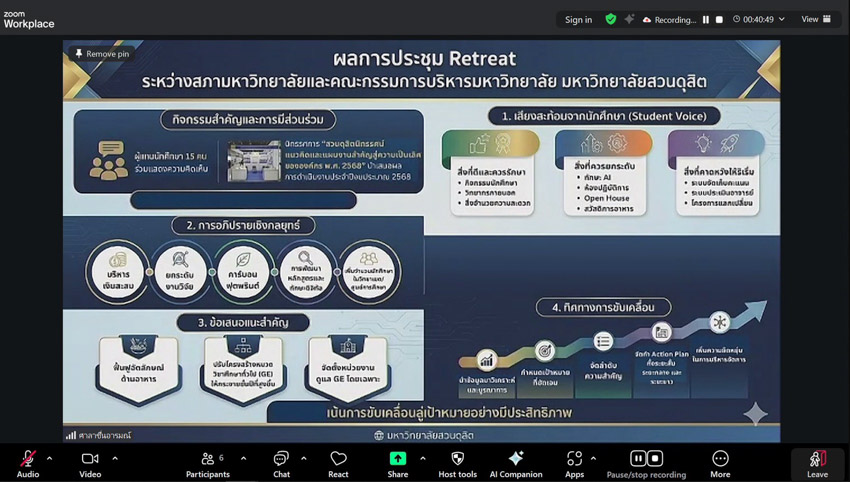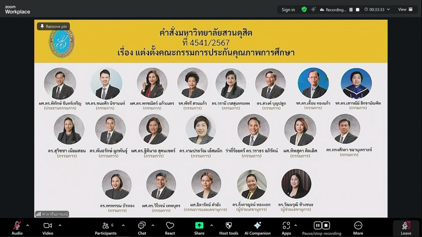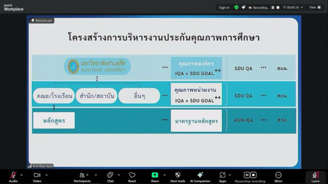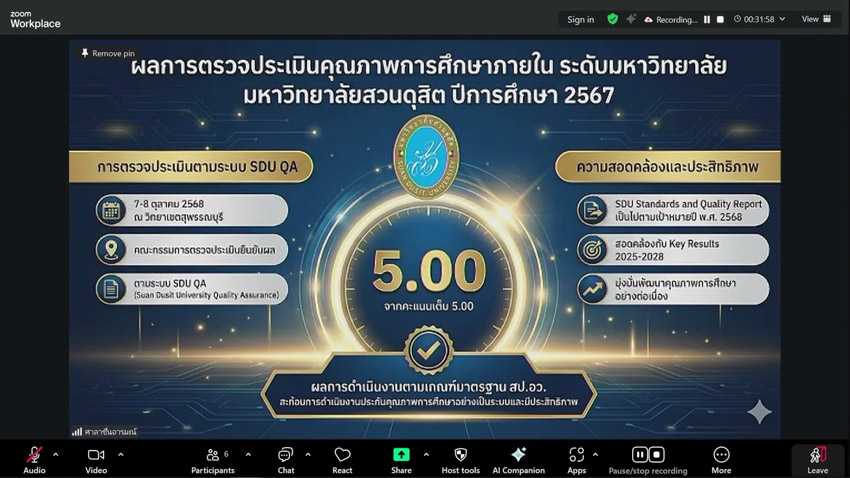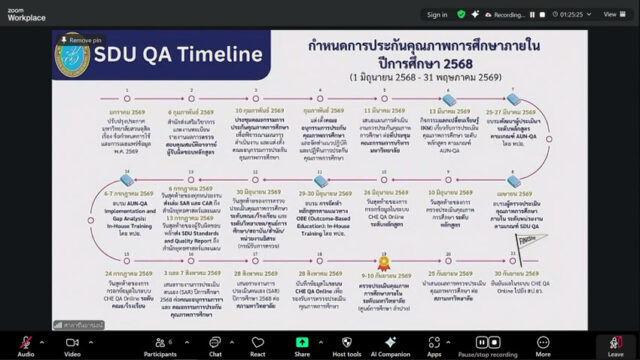 มหาวิทยาลัยสวนดุสิต วิทยาเขตสุพรรณบุรี นำโดย ดร.วรานี เวสสุนทรเทพ รองอธิการบดีฝ่ายวิทยาเขตสุพรรณบุรี และนางสาวจุฑารัตน์ จิ๋วสง่า ผู้อำนวยการกองกลาง เข้าร่วมการประชุมคณะกรรมการประกันคุณภาพการศึกษา ครั้งที่ 1(4)/2569 จัดโดยสำนักยุทธศาสตร์และแผน โดยมี ผู้ช่วยศาสตราจารย์ ดร.พิทักษ์ จันทร์เจริญ อธิการบดีมหาวิทยาลัยสวนดุสิต เป็นประธานในที่ประชุม ในวันอังคารที่ 10 กุมภาพันธ์ 2569 เวลา 09.30-11.30 น. ณ ห้องประชุมศาลาชื่นอารมณ์ โดยวิทยาเขตสุพรรณบุรี เข้าร่วมการประชุม ผ่านระบบออนไลน์ โปรแกรม ZOOM MEETING ห้องประชุม SDU Online Learning Room 12 ชั้น 3 อาคารสวนแก้ว 1 มหาวิทยาลัยสวนดุสิต วิทยาเขตสุพรรณบุรี
