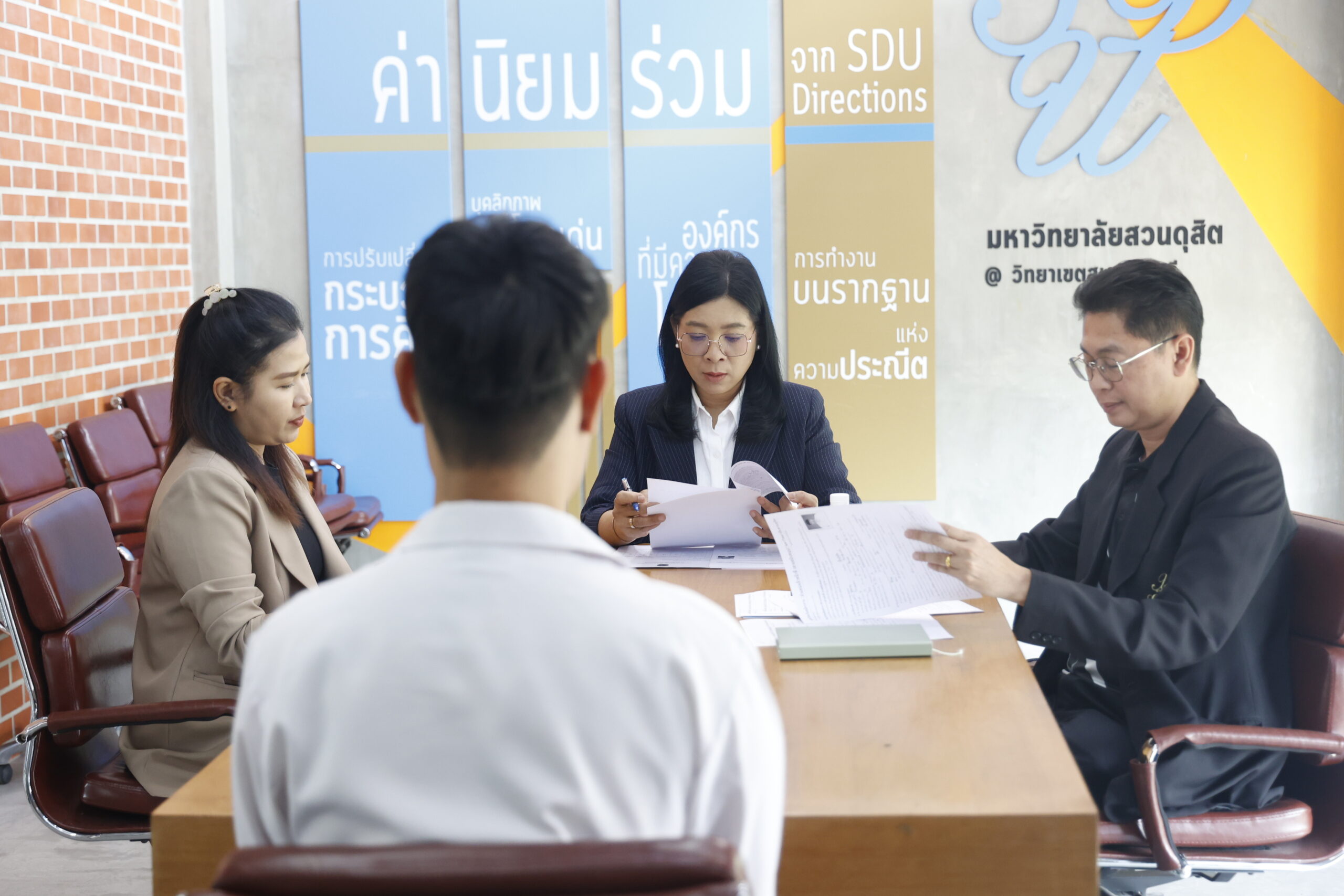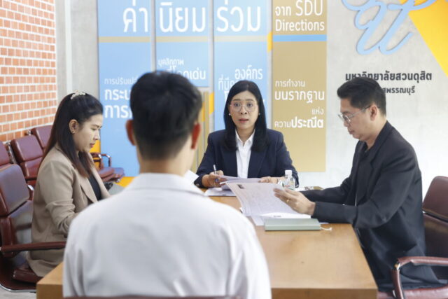 สำนักงานวิทยาเขตสุพรรณบุรี มหาวิทยาลัยสวนดุสิต จัดการสัมภาษณ์บุคคลเพื่อรับเข้าทำงานในตำแหน่ง เจ้าหน้าที่สำนักงาน (บริหารงานทั่วไป) จำนวน 1 อัตรา สังกัดกองอาคารและสิ่งแวดล้อม นำโดย นางกัณณ์อลิน สุอังคะวาทิน ผู้อำนวยการสำนักงานวิทยาเขตสุพรรณบุรี, นายปริญญา หนูนุรัตน์ ผู้อำนวยการกองอาคารและสิ่งแวดล้อม พร้อมด้วยเจ้าหน้าที่ในส่วนงานที่เกี่ยวข้อง เป็นกรรมการสัมภาษณ์ ในวันพฤหัสบดีที่ 5 มีนาคม 2569 เวลา 14.00 น. เป็นต้นไป ณ ห้องประชุม 1 ชั้น 2  อาคารศูนย์การเรียนรู้ระบบใหม่โดยใช้เทคโนโลยีเป็นสื่อ (SDU Library@Suphanburi) มหาวิทยาลัยสวนดุสิต วิทยาเขตสุพรรณบุรี