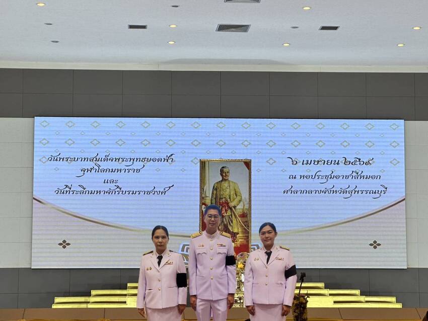 มหาวิทยาลัยสวนดุสิต วิทยาเขตสุพรรณบุรี นำโดย นายปริญญา หนูนุรัตน์ ผู้อำนวยการกองอาคารและสิ่งแวดล้อม พร้อมบุคลากรกองอาคารและสิ่งแวดล้อม เข้าวางพานพุ่มถวายราชสักการะ เนื่องในงานรัฐพิธี “วันพระบาทสมเด็จพระพุทธยอดฟ้าจุฬาโลกมหาราช และวันที่ระลึกมหาจักรีบรมราชวงศ์” โดยมี นายณัฐพงษ์ สงวนจิตร ผู้ว่าราชการจังหวัดสุพรรณบุรี เป็นประธานในพิธี ในวันจันทร์ที่ 6 เมษายน 2569 เวลา 07.00 น. ณ หอประชุมอาชาสีหมอก ศาลากลางจังหวัดสุพรรณบุรี