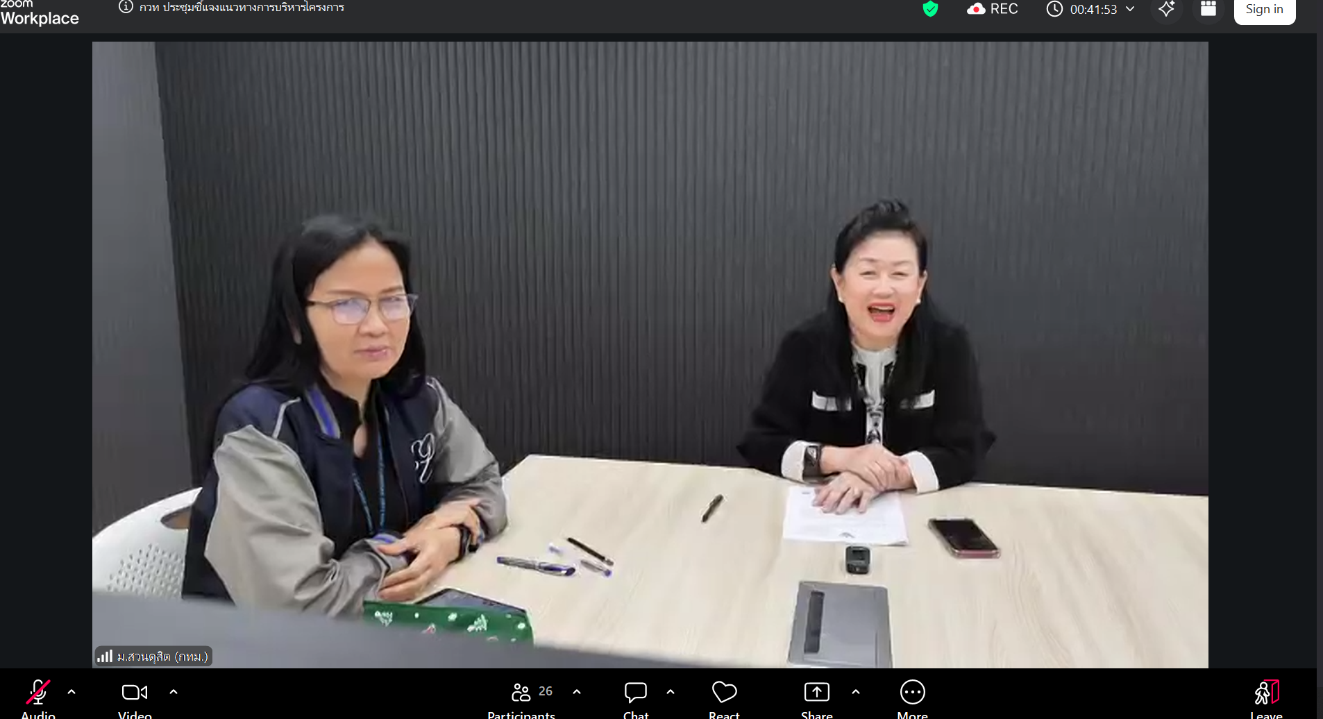 มหาวิทยาลัยสวนดุสิต วิทยาเขตสุพรรณบุรี เข้าร่วมประชุมชี้แจงแนวทางการบริหารโครงการ ผ่านระบบอิเล็กทรอนิกส์ (กองทุนสิ่งแวดล้อม) นำโดย ดร.วรานี เวสสุนทรเทพ รองอธิการบดีฝ่ายวิทยาเขตสุพรรณบุรี เข้าร่วมการประชุม ณ ห้องประชุม Online 19 อาคาร 11 มหาวิทยาลัยสวนดุสิต โดยมี นางสาวจิตตินันท์ เรืองวีรยุทร ผู้อำนวยการกองบริหารกองทุนสิ่งแวดล้อม เป็นประธานการประชุม และวิทยาเขตสุพรรณบุรี นำโดย นางกัณณ์อลิน สุอังคะวาทิน ผู้อำนวยการสำนักงานวิทยาเขตสุพรรณบุรี พร้อมด้วยผู้บริหาร และเจ้าหน้าที่ในส่วนงานที่เกี่ยวข้อง เข้าร่วมการประชุมในรูปแบบ Online ผ่านโปรแกรม Zoom Meeting ในวันพฤหัสบดีที่ 9 เมษายน 2569 เวลา 09.30-12.00 น. ณ ห้อง SDU Online Learning Room 12 ชั้น 3 อาคารสวนแก้ว 1 มหาวิทยาลัยสวนดุสิต วิทยาเขตสุพรรณบุรี