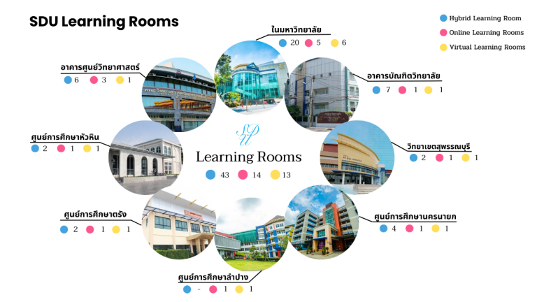 ห้องเรียน SDU Learning Rooms เป็นห้องที่ให้บริการสำหรับการจัดการเรียนการสอน มีให้บริการทั้งในมหำวิทยาลัย วิทยาเขต และศูนย์การศึกษำ นักศึกษาสามารถใช้บริกำรห้องนี้ในลักษณะการจัดกิจกรรมออนไลน์ และผลิตสื่อ คลิปวิดีโอ โดยลักษณะของห้องจะแบ่งออกเป็น 3 ประเภท