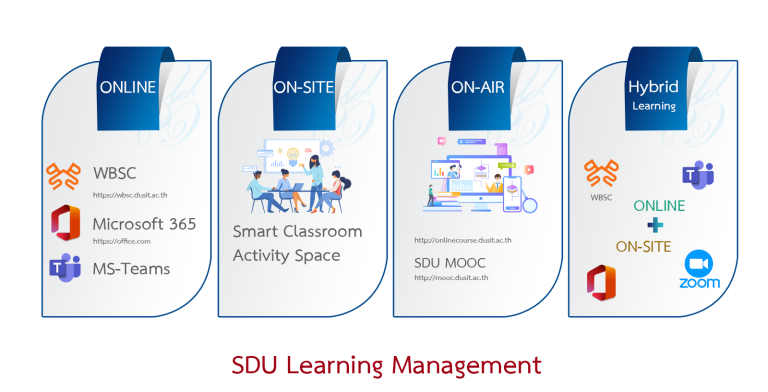 มหาวิทยาลัยสวนดุสิต ส่งเสริมการใช้เทคโนโลยีเพื่อให้ผู้เรียนมีความพร้อมในการเรียนรู้ และทุกพื้นที่สามารถเอื้อต่อการเรียนรู้ให้สามารถเกิดการเรียนรู้ได้ตลอดเวลา เพื่อให้เกิดกระบวนการเรียนรู้ในรูปแบบ Blended Learning ที่ผสมผสมการเรียนรู้ทั้งในและนอกห้องเรียน สร้างโอกาสในการเข้าถึงสื่อ เทคโนโลยี เครื่องมือ และแหล่งการเรียนรู้ต่างๆ ที่มีคุณภาพ โดยคำนึงถึงสภาพแวดล้อมการเรียนรู้ที่เหมาะสมกับรูปแบบการจัดการเรียนรู้ โดยมหาวิทยาลัยสวนดุสิต มีรูปแบบการจัดการเรียนรู้ออกเป็น 4 รูปแบบ ได้แก่ การเรียนแบบ Online การเรียนแบบ On-site การเรียนแบบ On-Air และการเรียนแบบ Hybrid