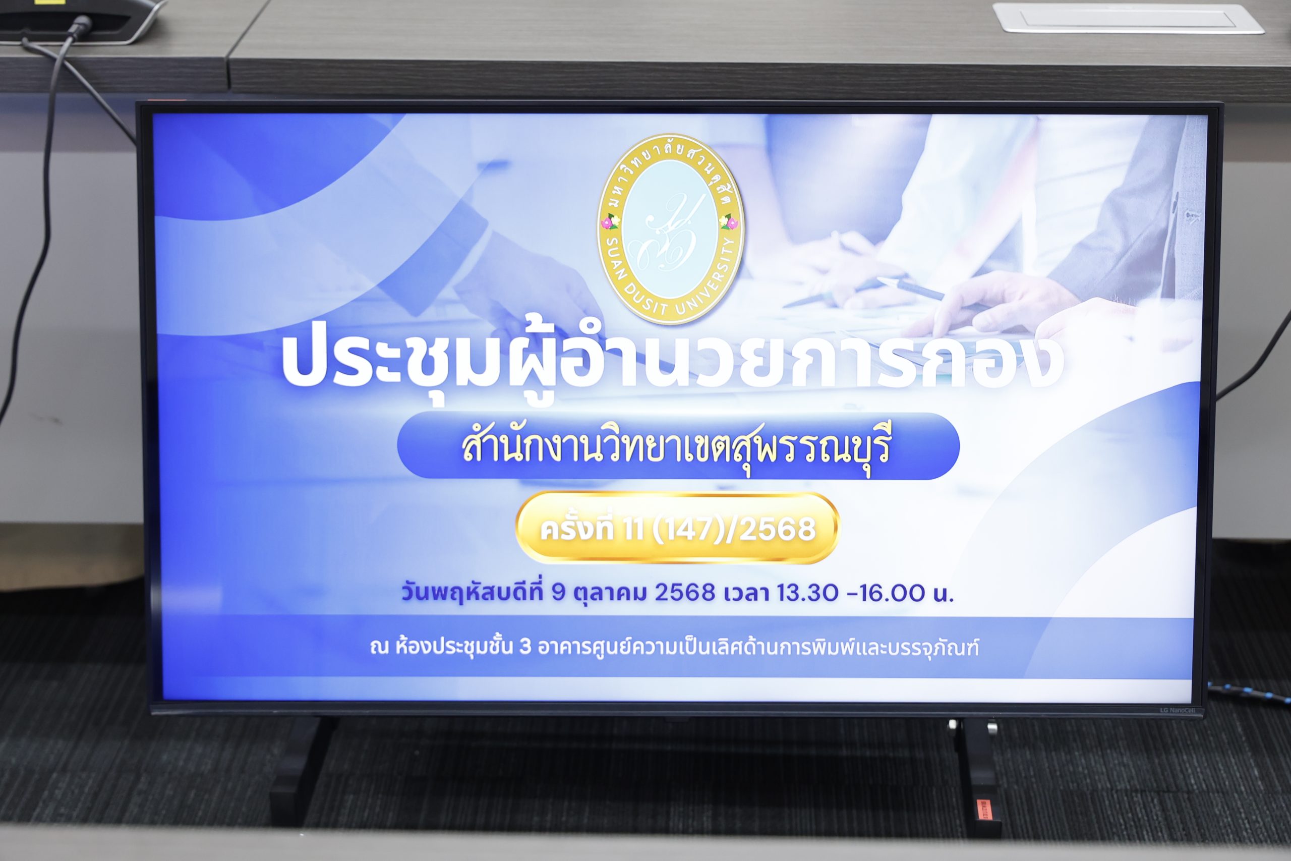 กองกลาง สำนักงานวิทยาเขตสุพรรณบุรี มหาวิทยาลัยสวนดุสิต จัดประชุมผู้อำนวยการกอง สำนักงานวิทยาเขตสุพรรณบุรี ครั้งที่ 11 (147)/2568 โดยมี ดร.วรานี เวสสุนทรเทพ รองอธิการบดีฝ่ายวิทยาเขตสุพรรณบุรี เป็นประธานในการประชุม พร้อมด้วยคณะผู้บริหาร และบุคลากรในส่วนงานที่เกี่ยวข้อง เข้าร่วมประชุมโดยพร้อมเพียง ในวันพฤหัสบดี ที่ 9 ตุลาคม 2568 เวลา 13.00-16.00 น. ณ ห้องประชุม ชั้น 3 อาคารศูนย์ความเป็นเลิศด้านการพิมพ์และบรรจุภัณฑ์ มหาวิทยาลัยสวนดุสิต วิทยาเขตสุพรรณบุรี